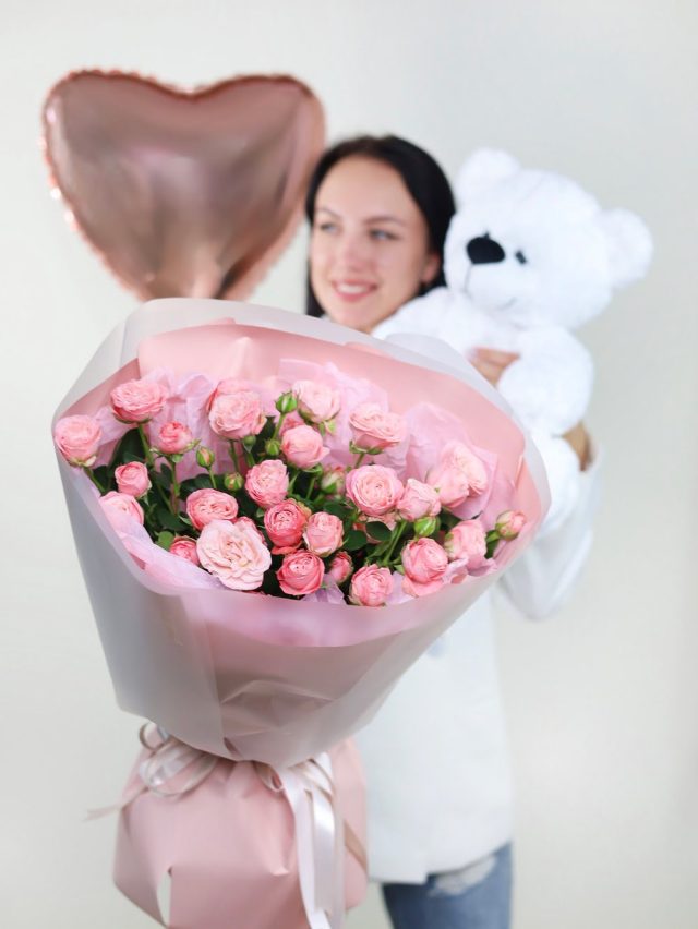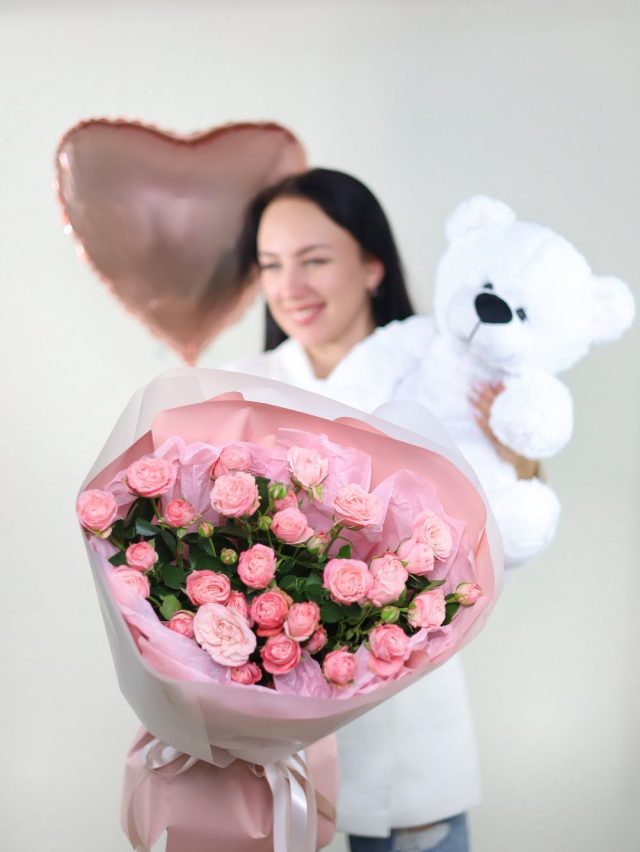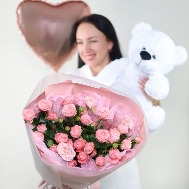 • воздушный букет из 7-ми веток кустовых пионовидных роз