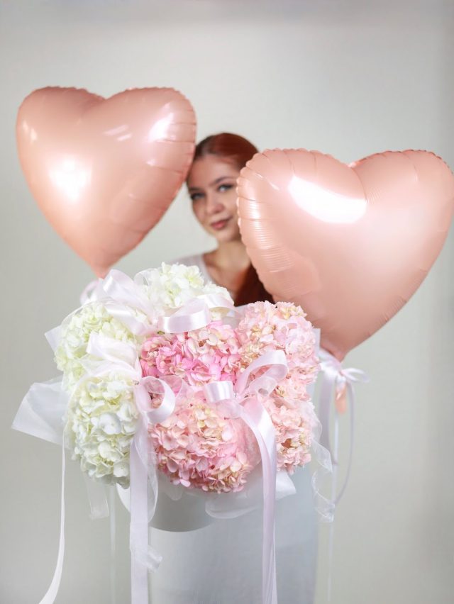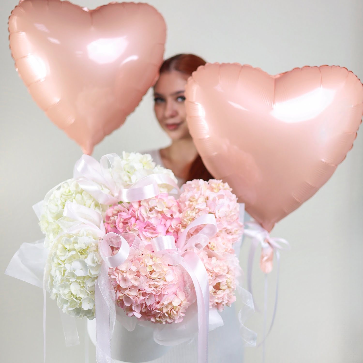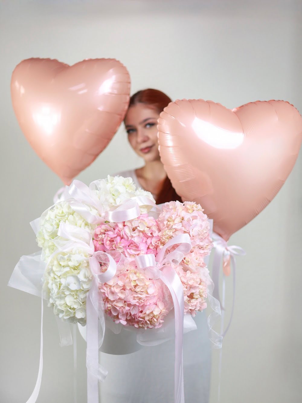• воздушная композиция из нежных гортензий с бантиками