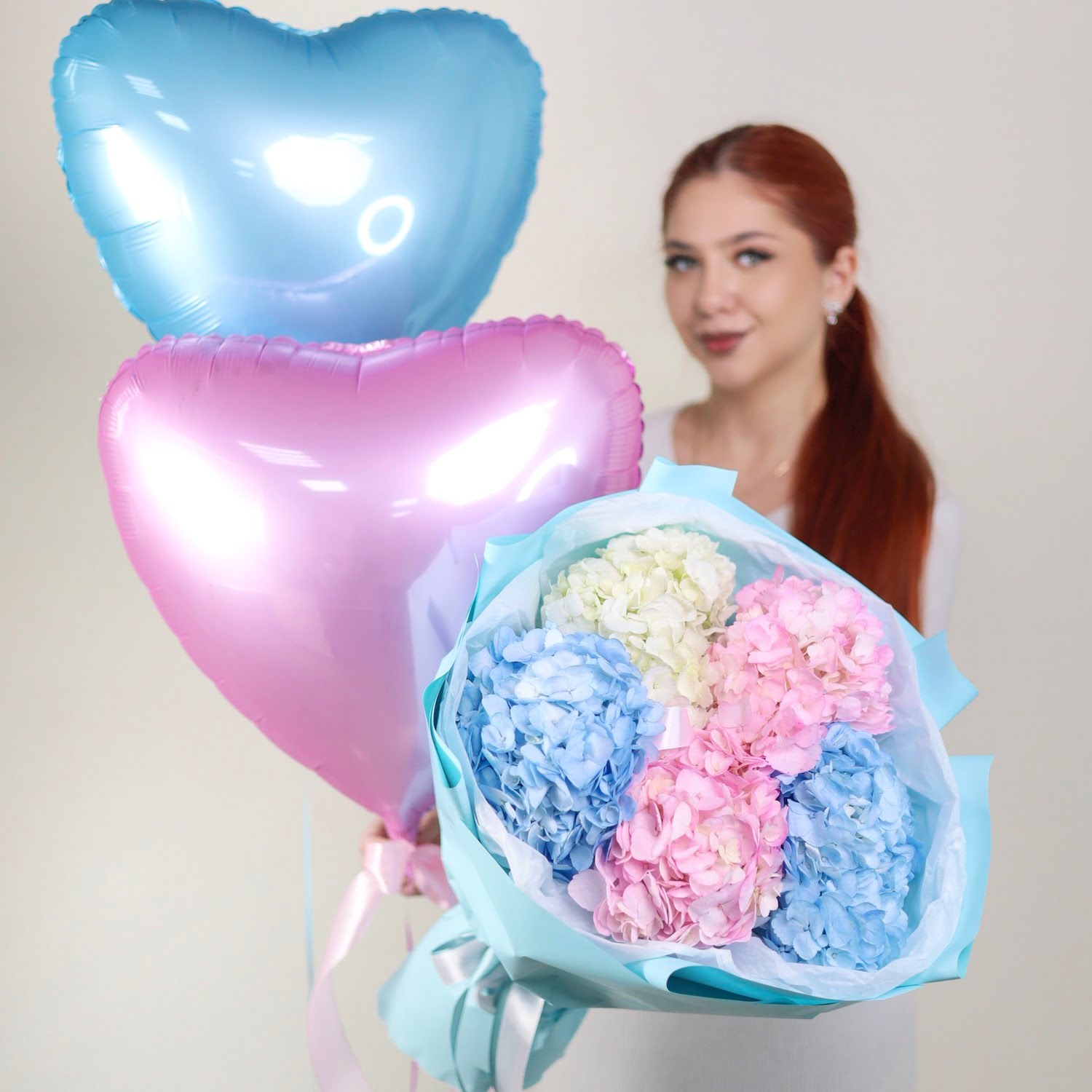 Очаровательный нежный сет из пышного букета гортензий и двух фольгированных шаров.