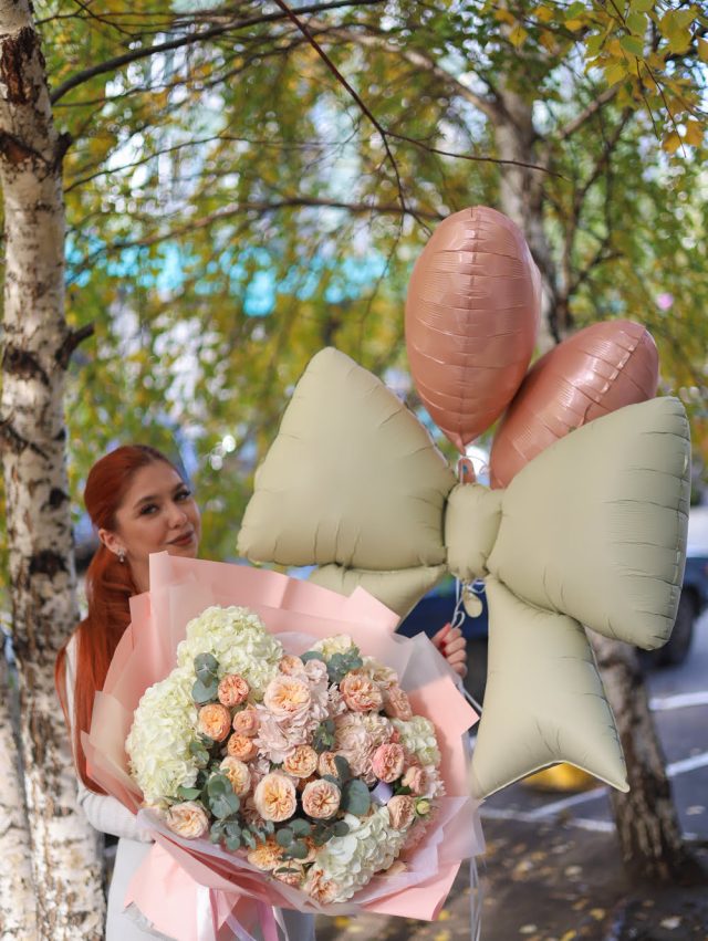 • роскошный авторский букет из пышных гортензий, крупных кустовых роз и эвкалипта