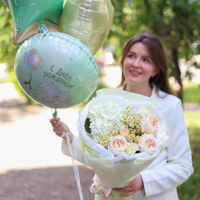 • очаровательный букет с пионовидными кустовыми и одноголовыми розами, пышной гортензией, стойкими диантусами, ароматными ромашками
