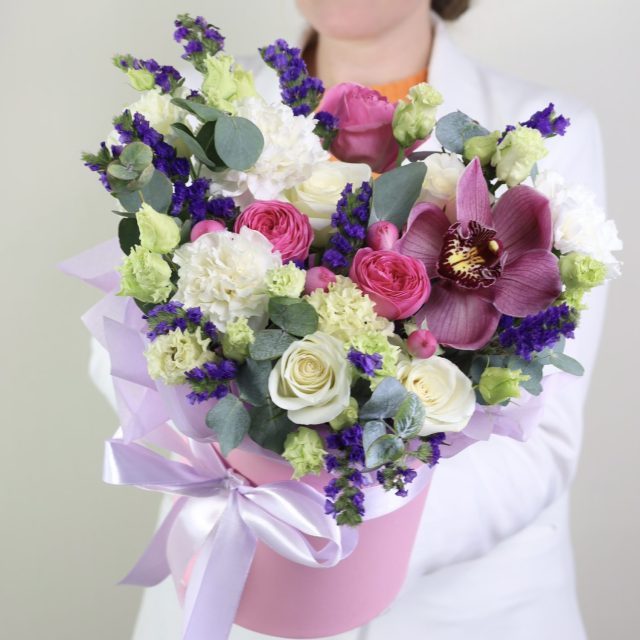 В составе композиции: орхидея, эустома, одноголовые розы, статица, диантусы, кустовая роза,