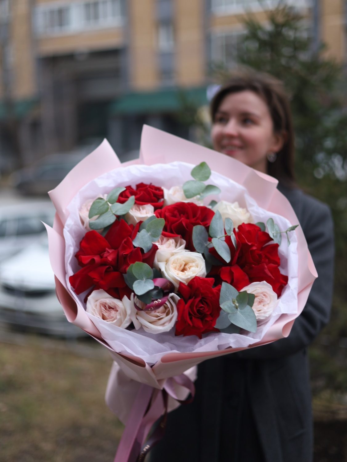 В составе букета: французские розы, пионовидные розы, эвкалипт
