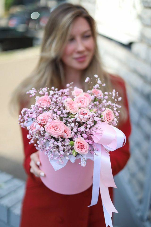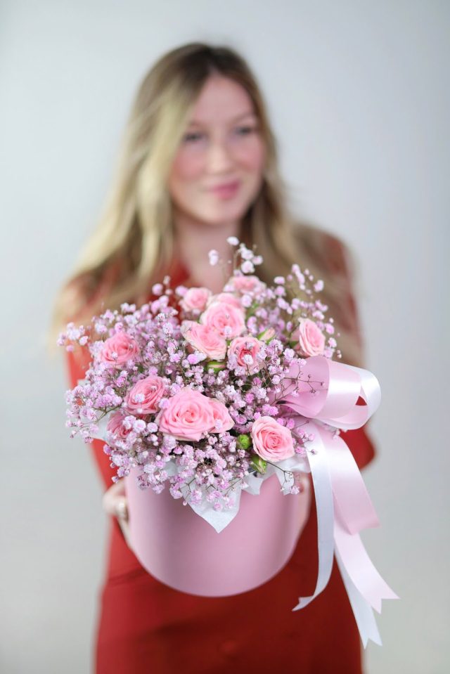 Очаровательная композиция в розовой гамме в шляпной коробке.