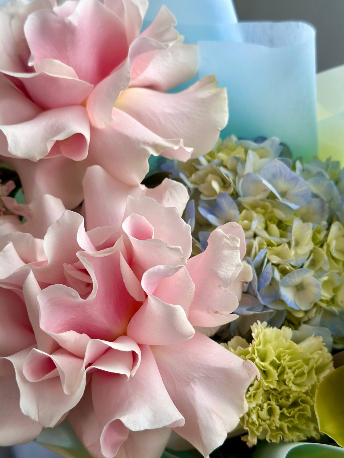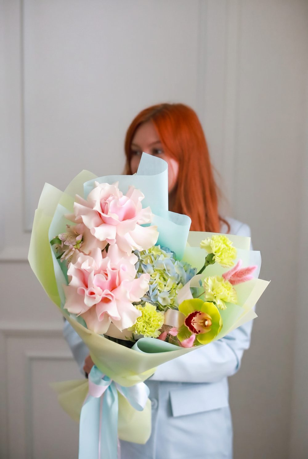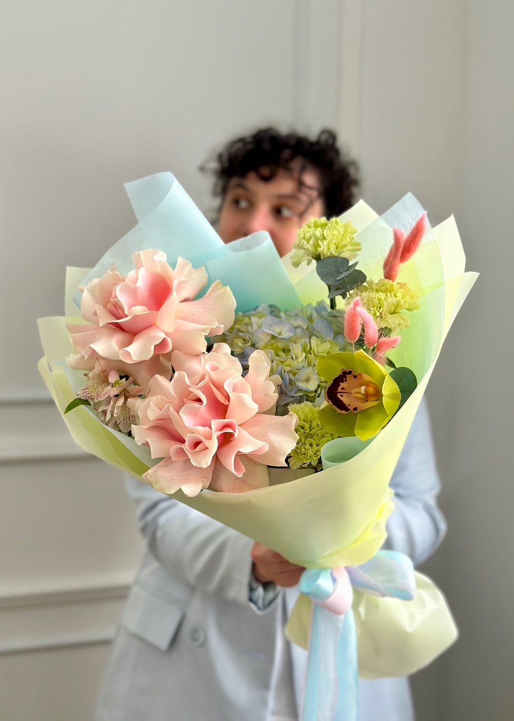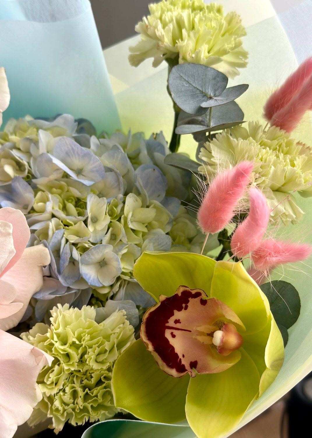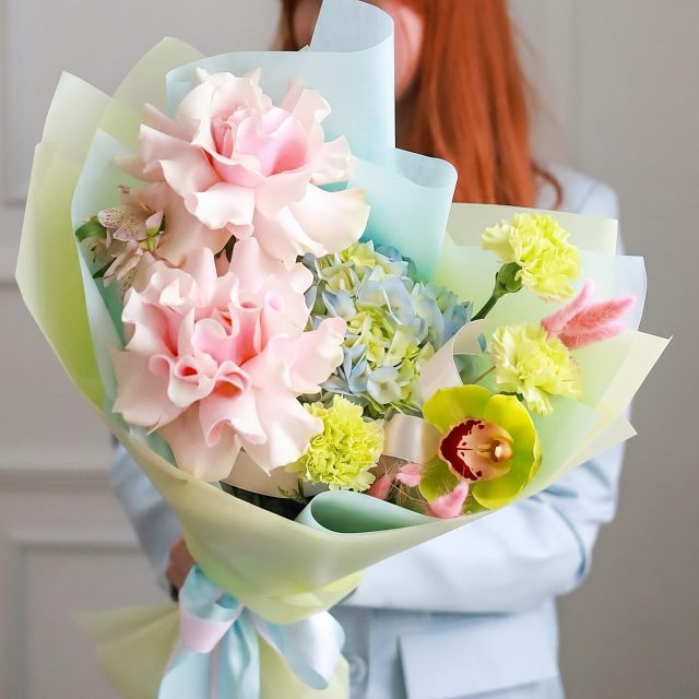 Состав: стойкие диантусы, альстромерия и орхидея, пышная гортензия, французские розы, лагурус.