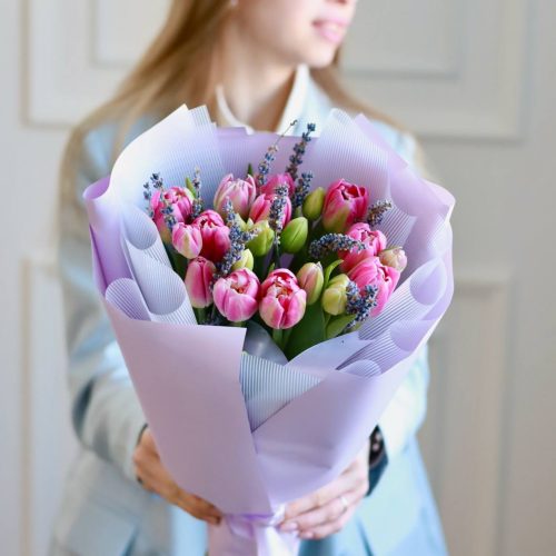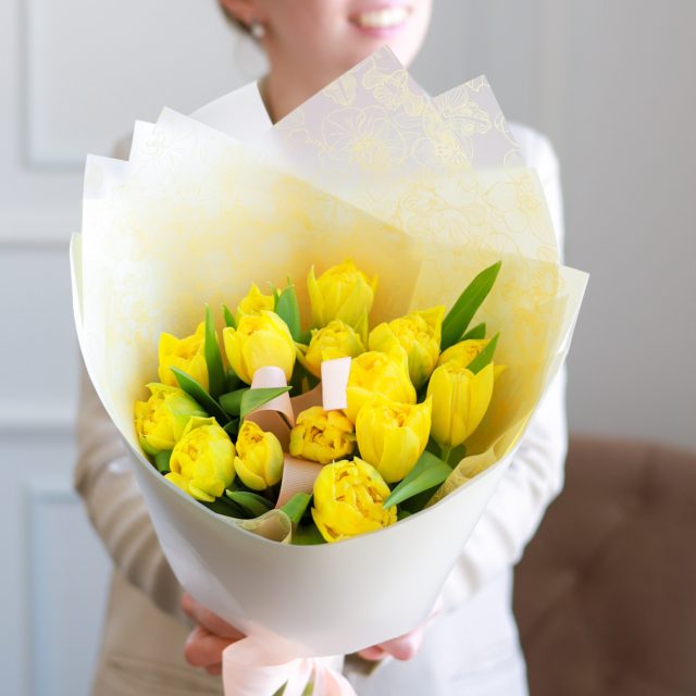 Прекрасный весенний букет желтых тюльпанов в оформлении.