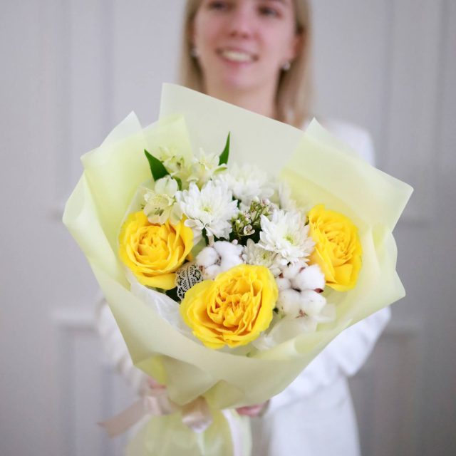 Букет из одноголовых желтых роз, альстромерий, хризантемы, с добавлением хлопка в оформлении