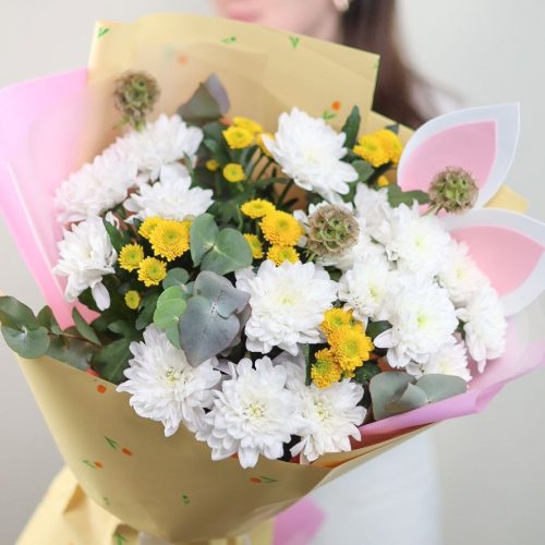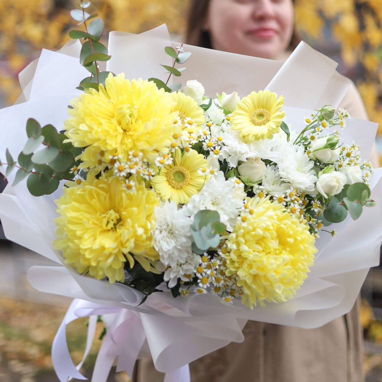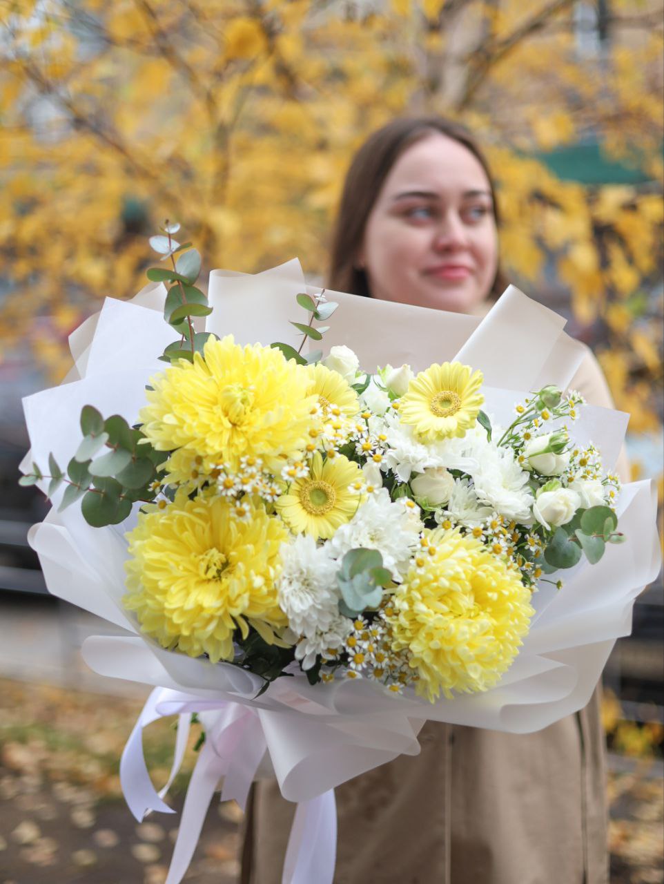 Букет с крупной хризантемой и кустовой хризрнтемой, герберой, кустовой розой, ароматной ромашкой и эвкалиптом в оформлении.