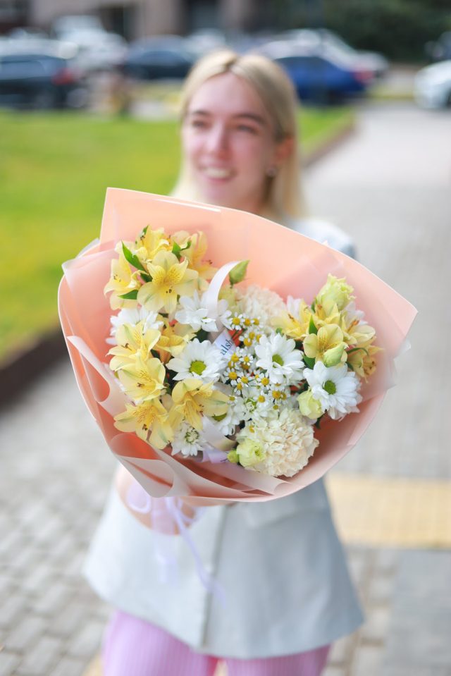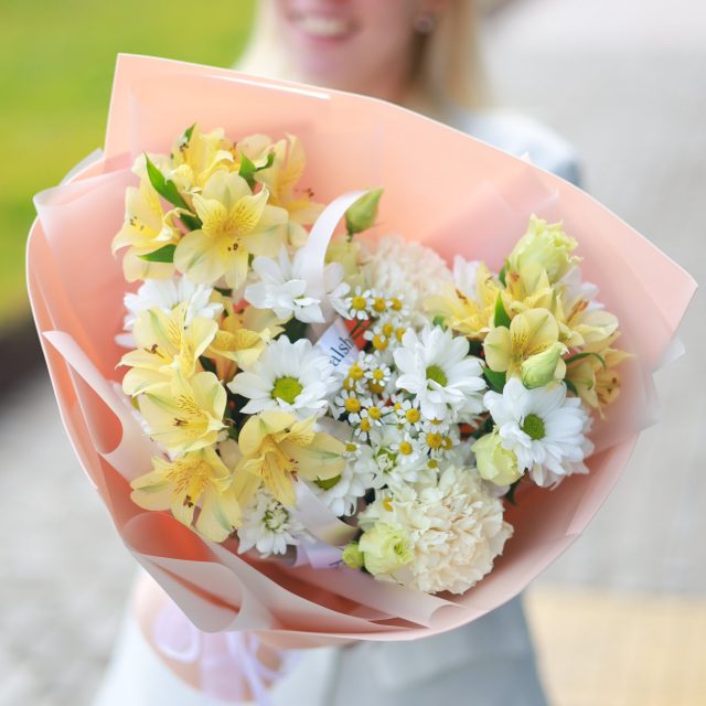 Состав: ароматные ромашки, стойкие диантусы, хризантема и альстромерия.