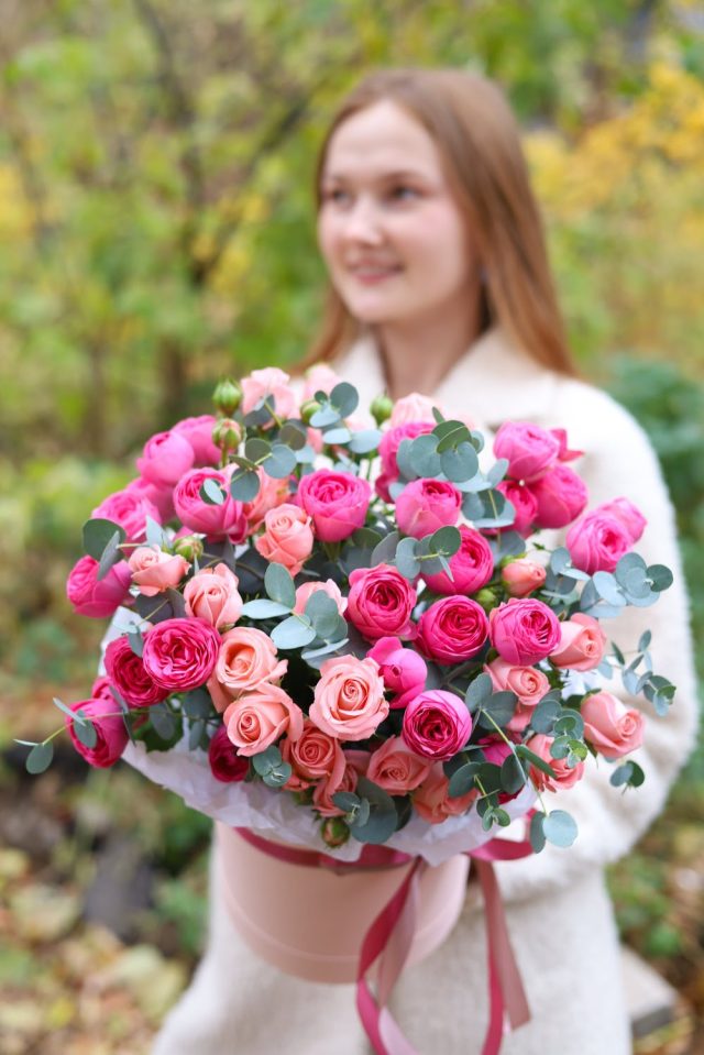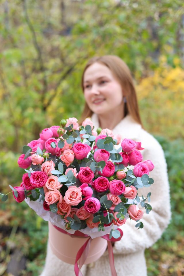 Прекрасная стильная композиция кустовых пионовидных роз микс с душистым эвкалиптом.
