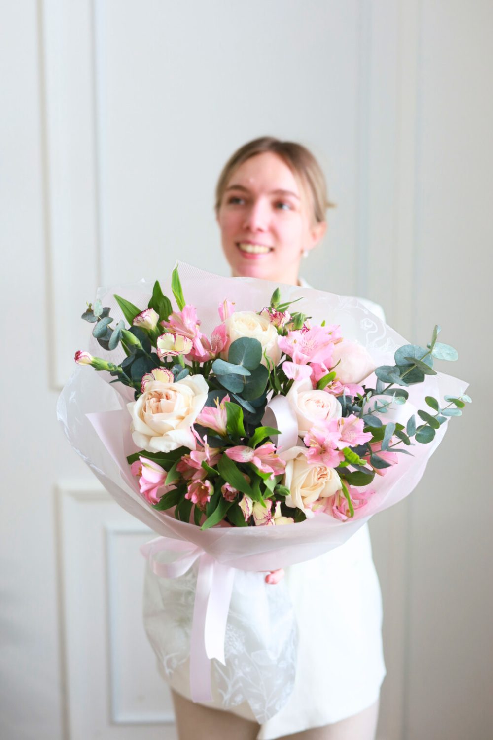 Состав: одноголовые пионовидные розы Вайт О’Хара, стойкая альстромерия, диантусы, эвкалипт.