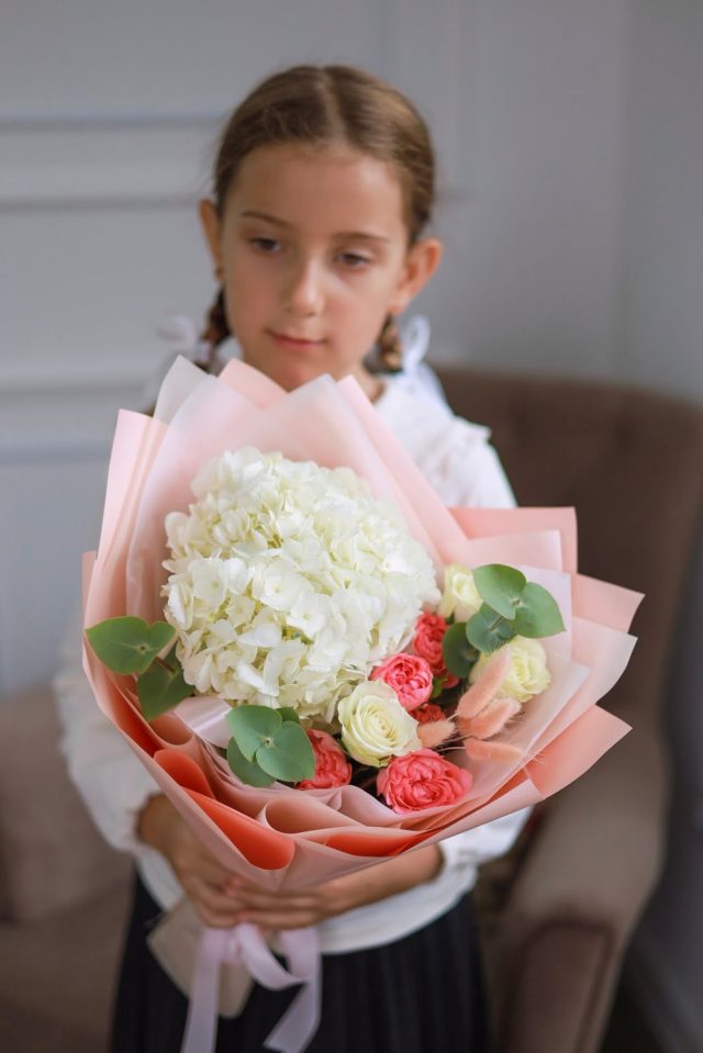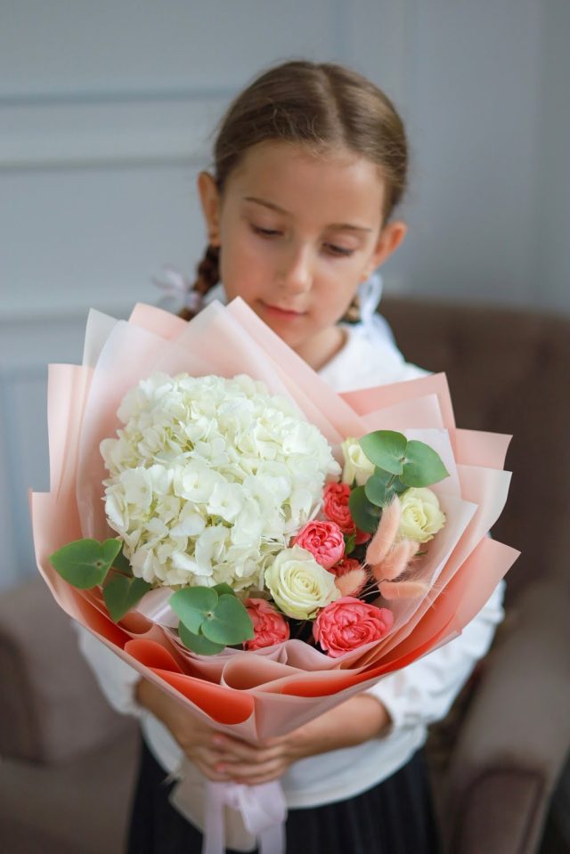 Прекрасный сборный букет в нежной гамме в оформлении – идеальный выбор для любимого учителя.