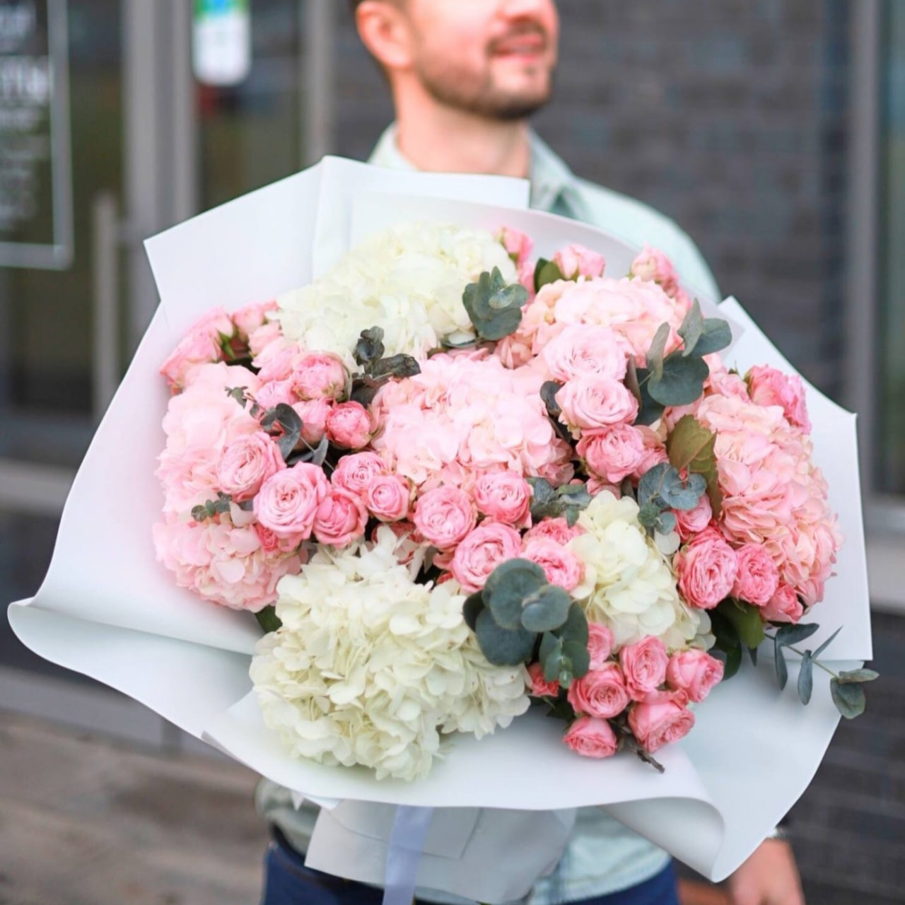 Состав: пышные гортензии, кустовые пионовидные розы, эвкалипт.