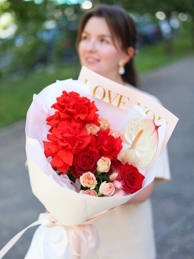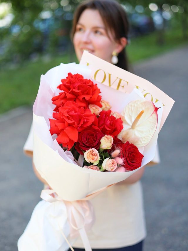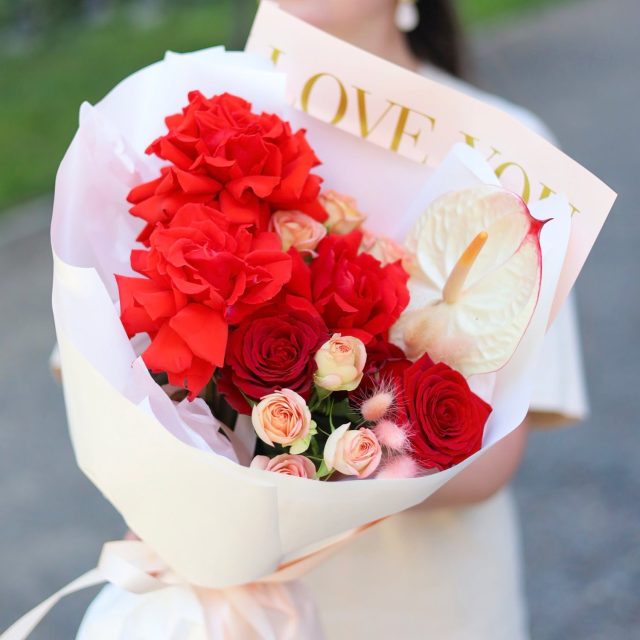 Состав: французские розы, экзотический антуриум, кустовые и одноголовые розы, сухоцветы.
