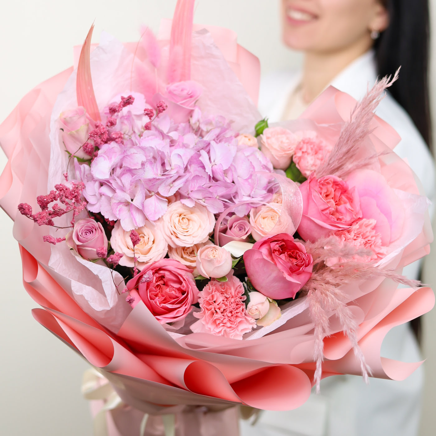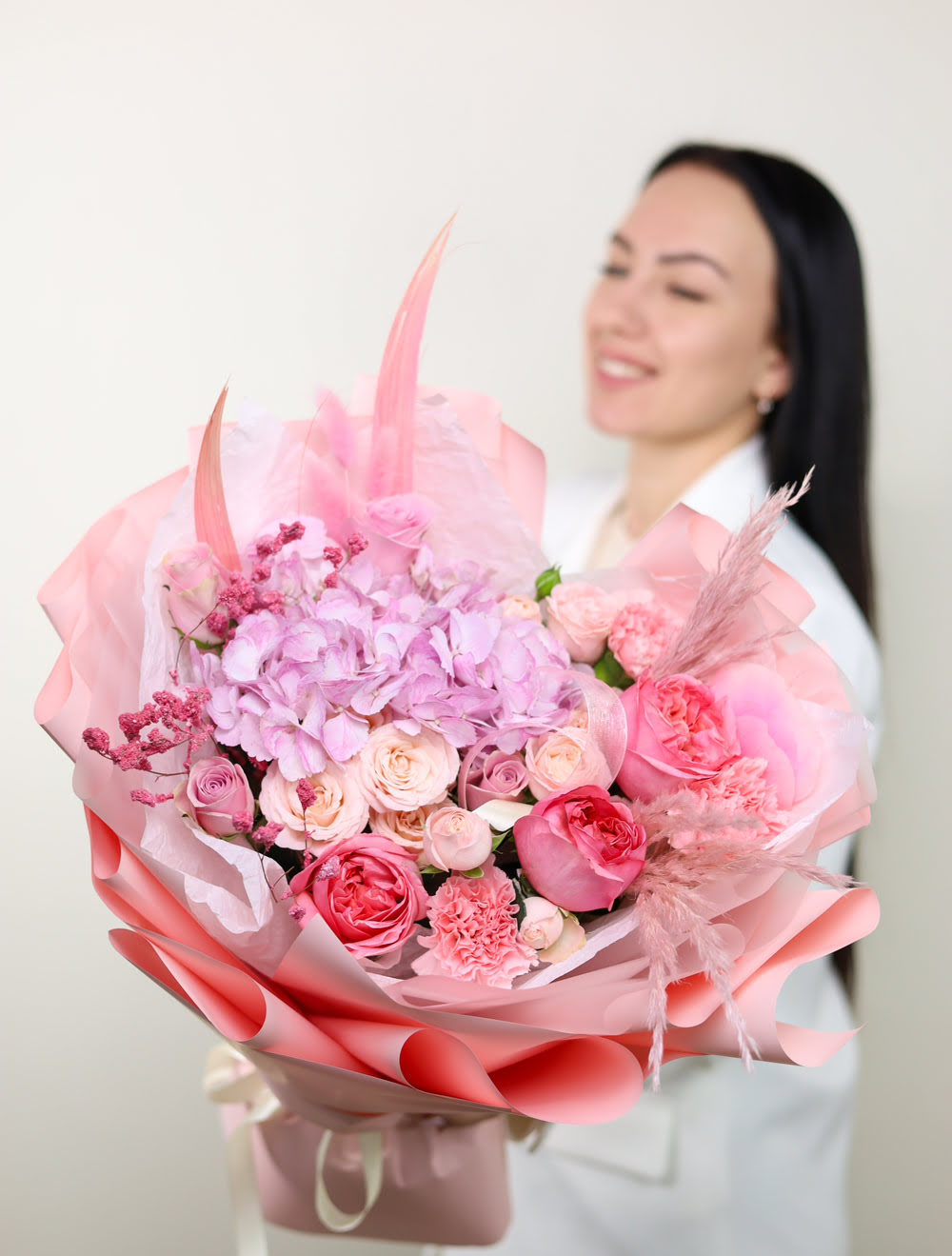 Очаровательный авторский букет в розовой гамме в стильном оформлении.