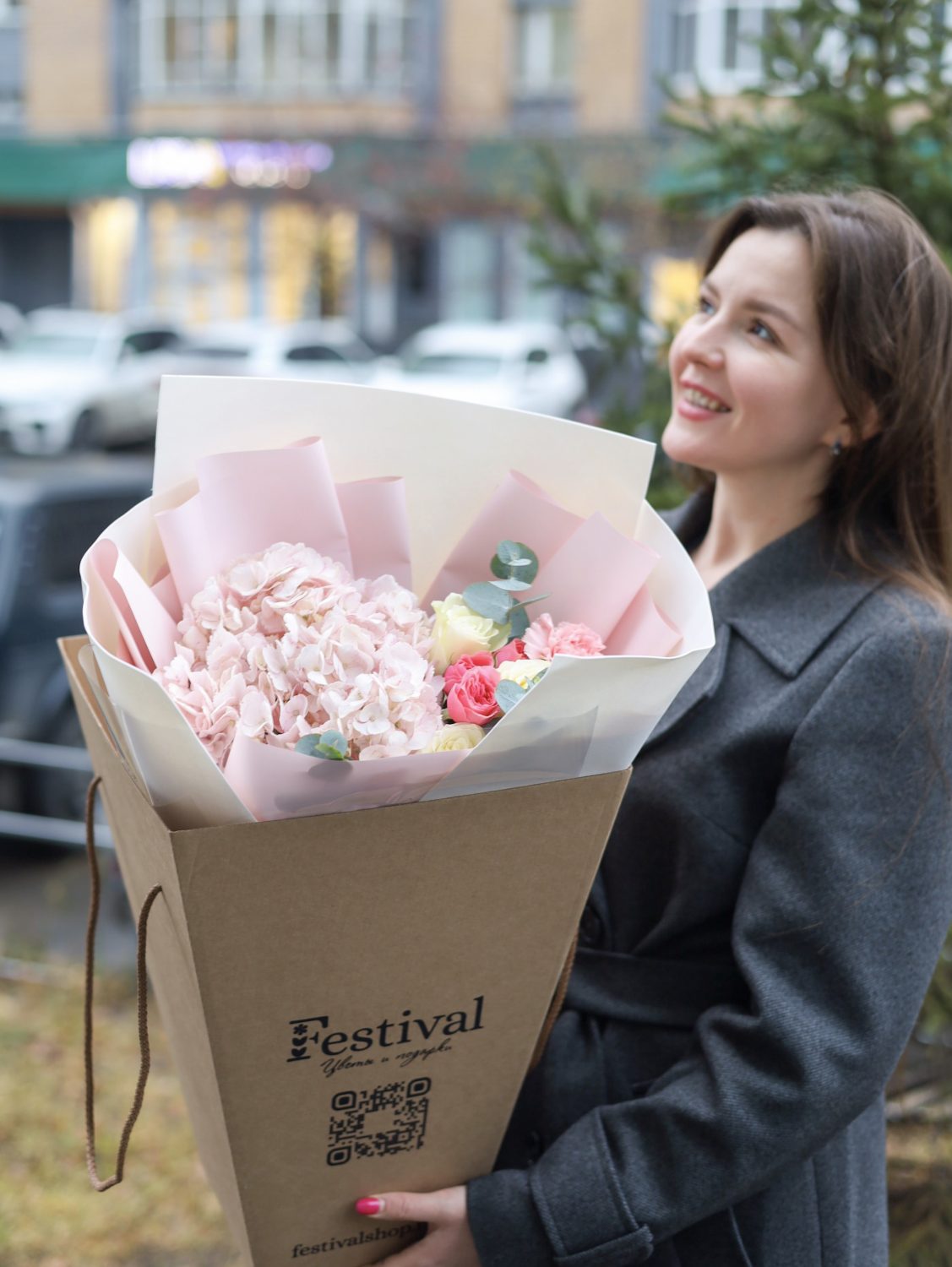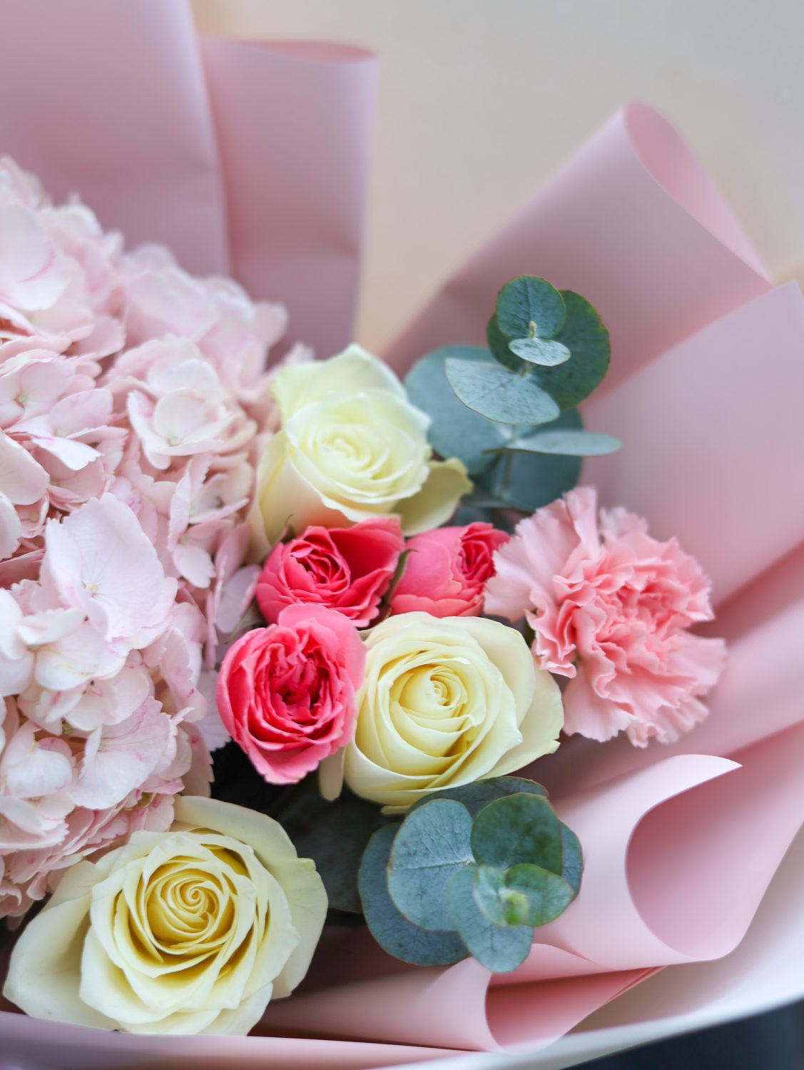 В букете: пышная гортензия, кустовые и одноголовые розы, диантус, эвкалипт.