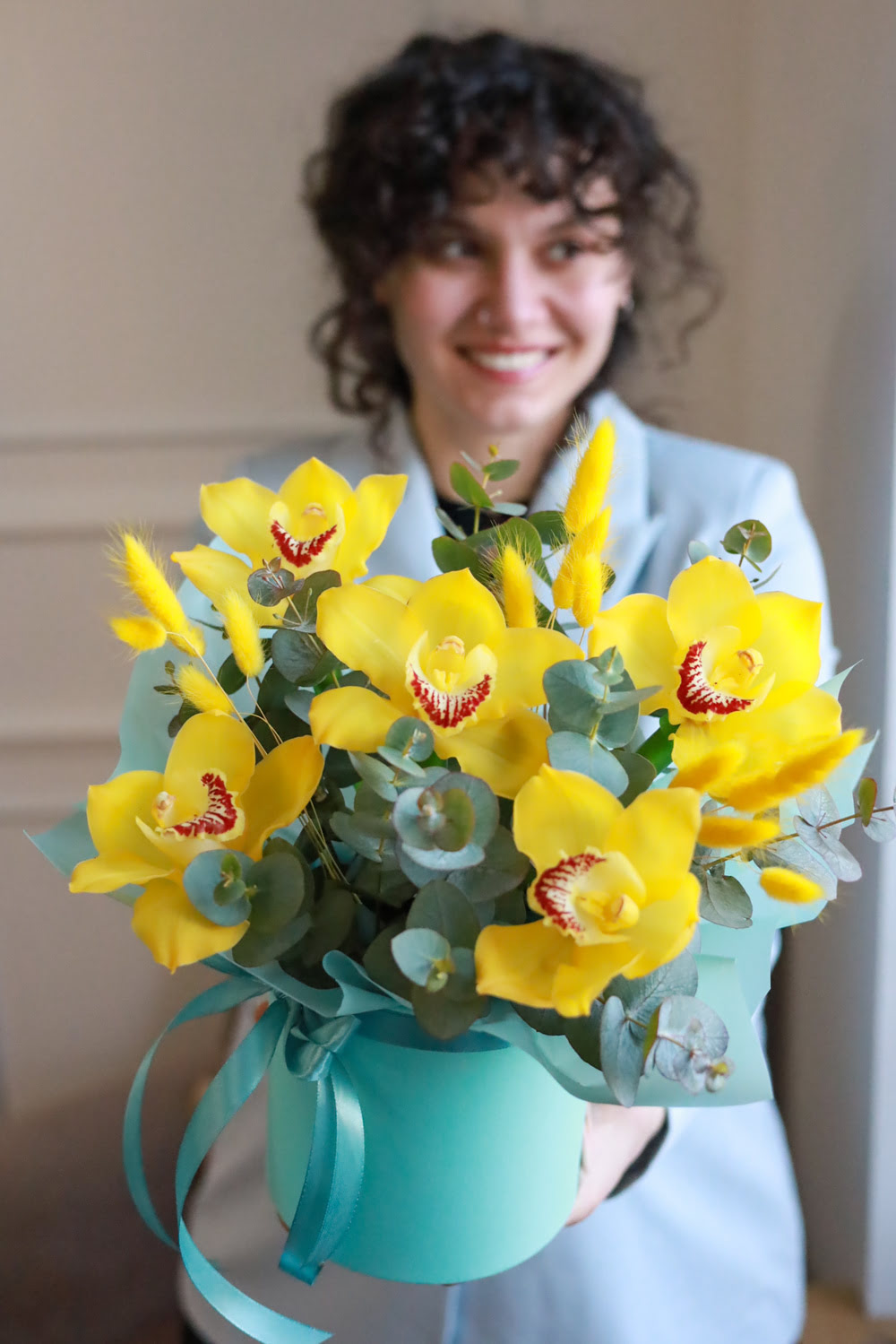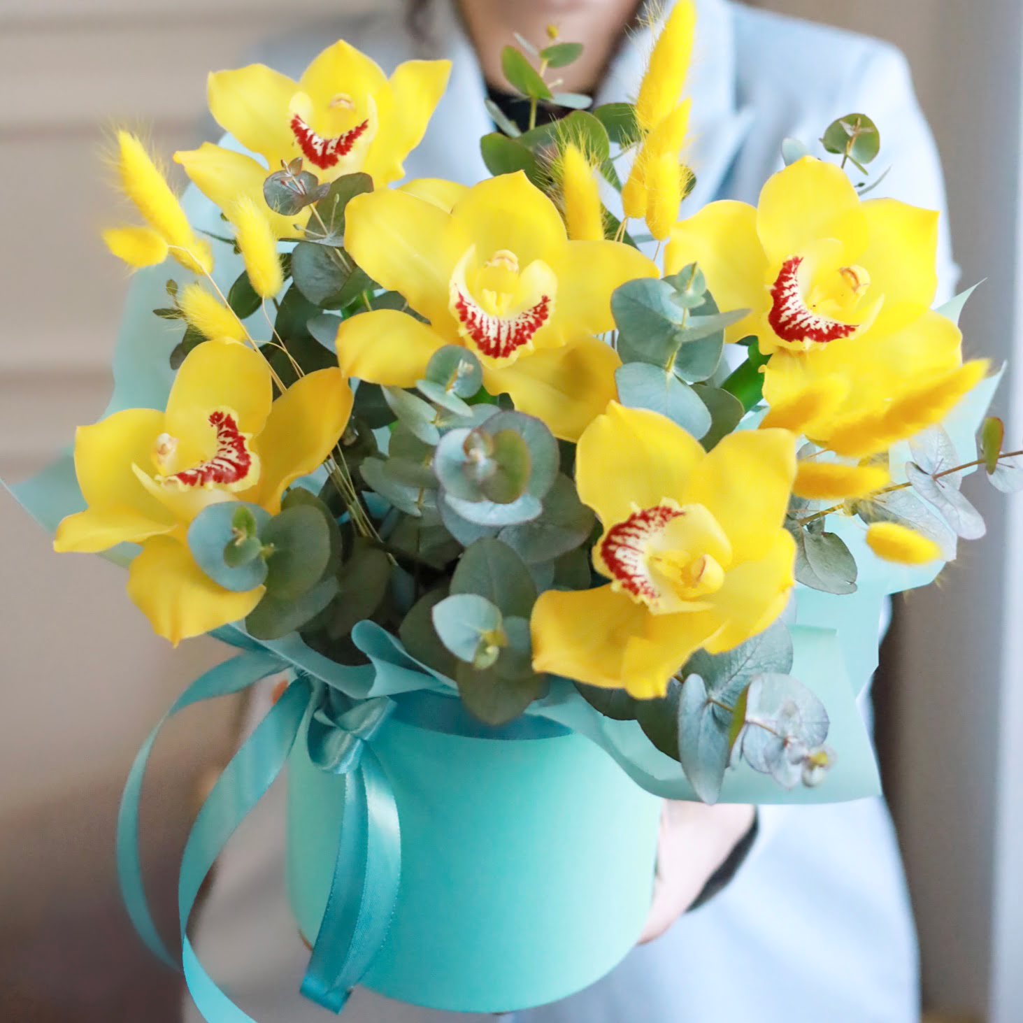 Очаровательная композиция из 5-ти желтых орхидей, эвкалипта и лагуруса.