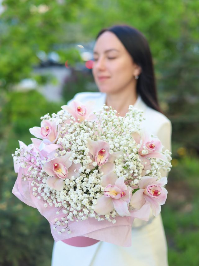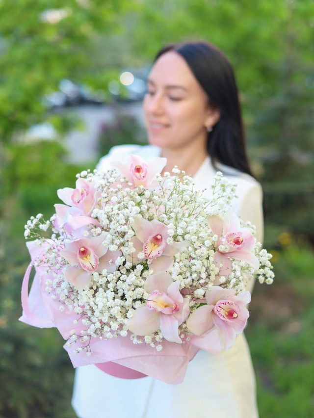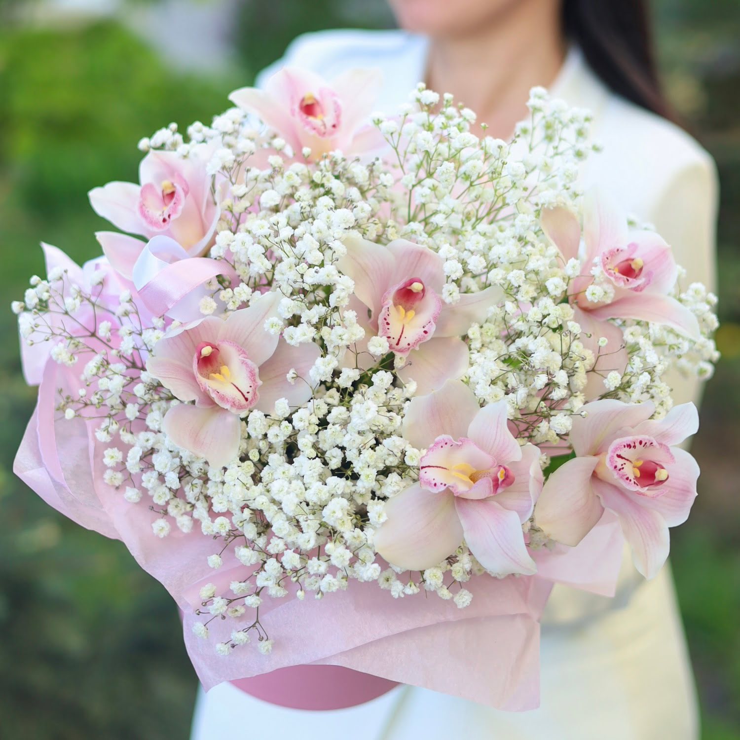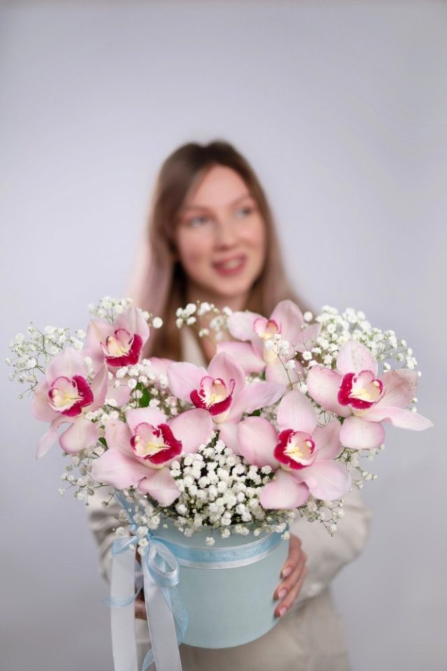 Очаровательная композиция с очень стойким составом: орхидеями (7 шт.) и гипсофилой в шляпной коробке.