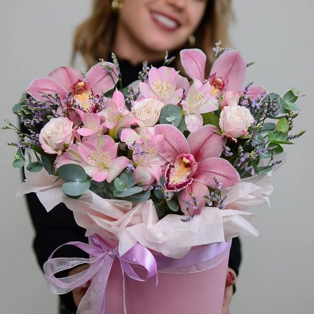 В композиции: орхидеи, альстромерии, кустовые розы, лимониум, эвкалипт.