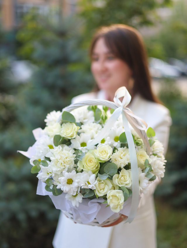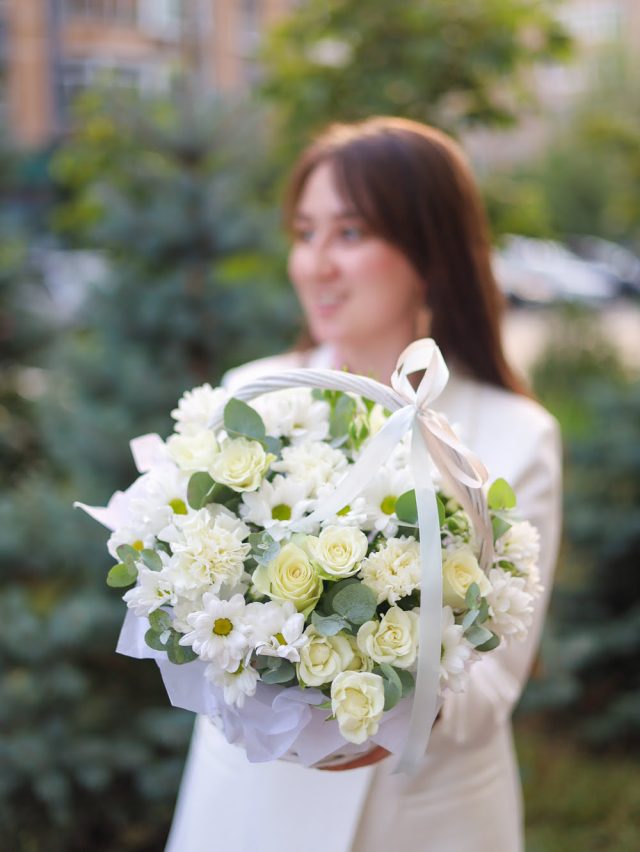 Очаровательная сборная композиция в белой гамме в плетеной корзине.