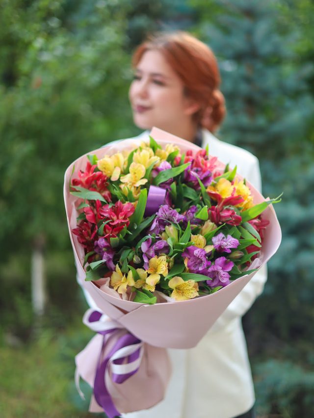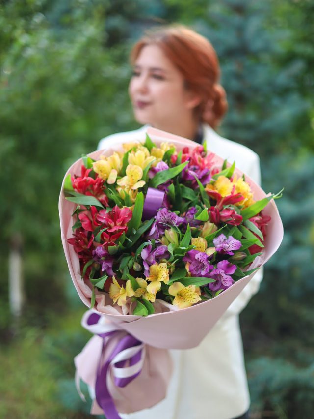 Красивый и стойкий букет из 15-ти веток альстромерии микс в оформлении.