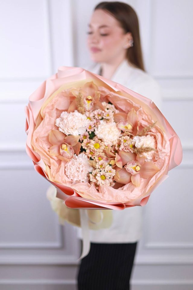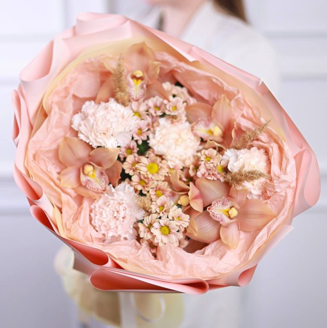 Состав: стойкие орхидеи, хризантемы и диантусы, сухоцветы.