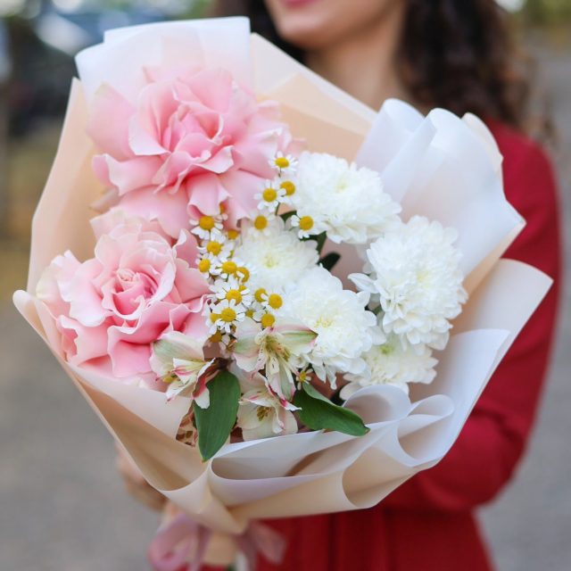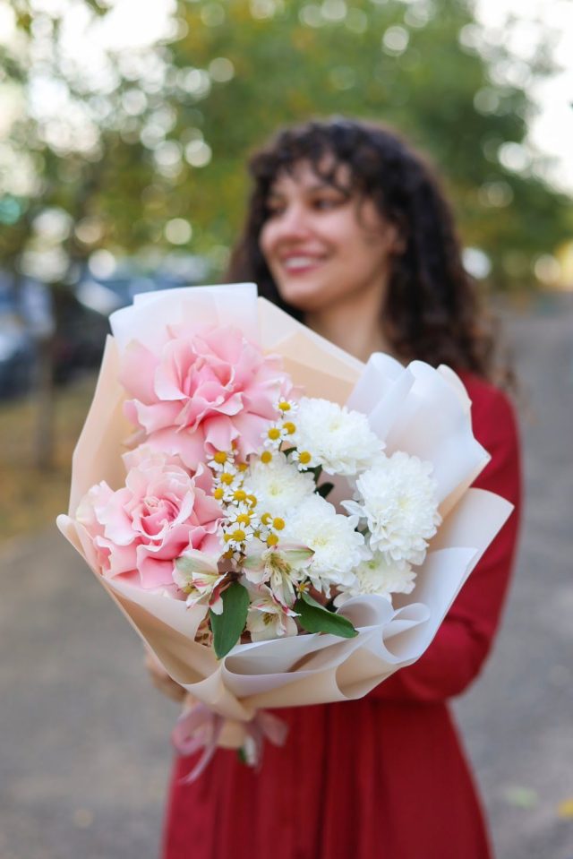 Состав: французские розы, ароматные ромашки, стойкие альстромерия и хризантема.