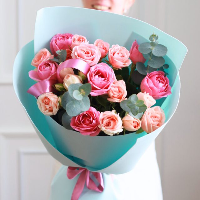 Очаровательный букет одноголовых и кустовых роз с эвкалиптом в стильном оформлении.