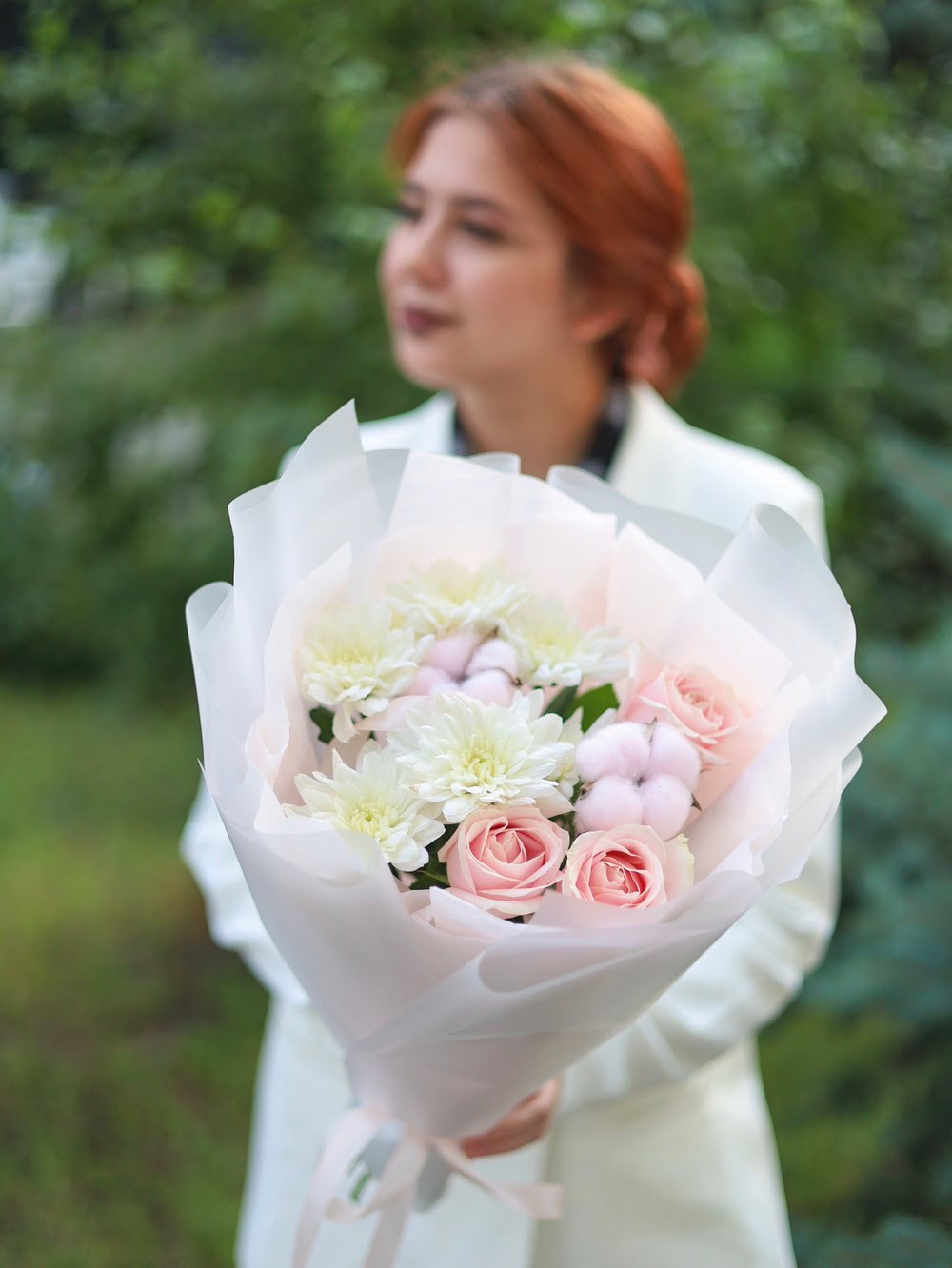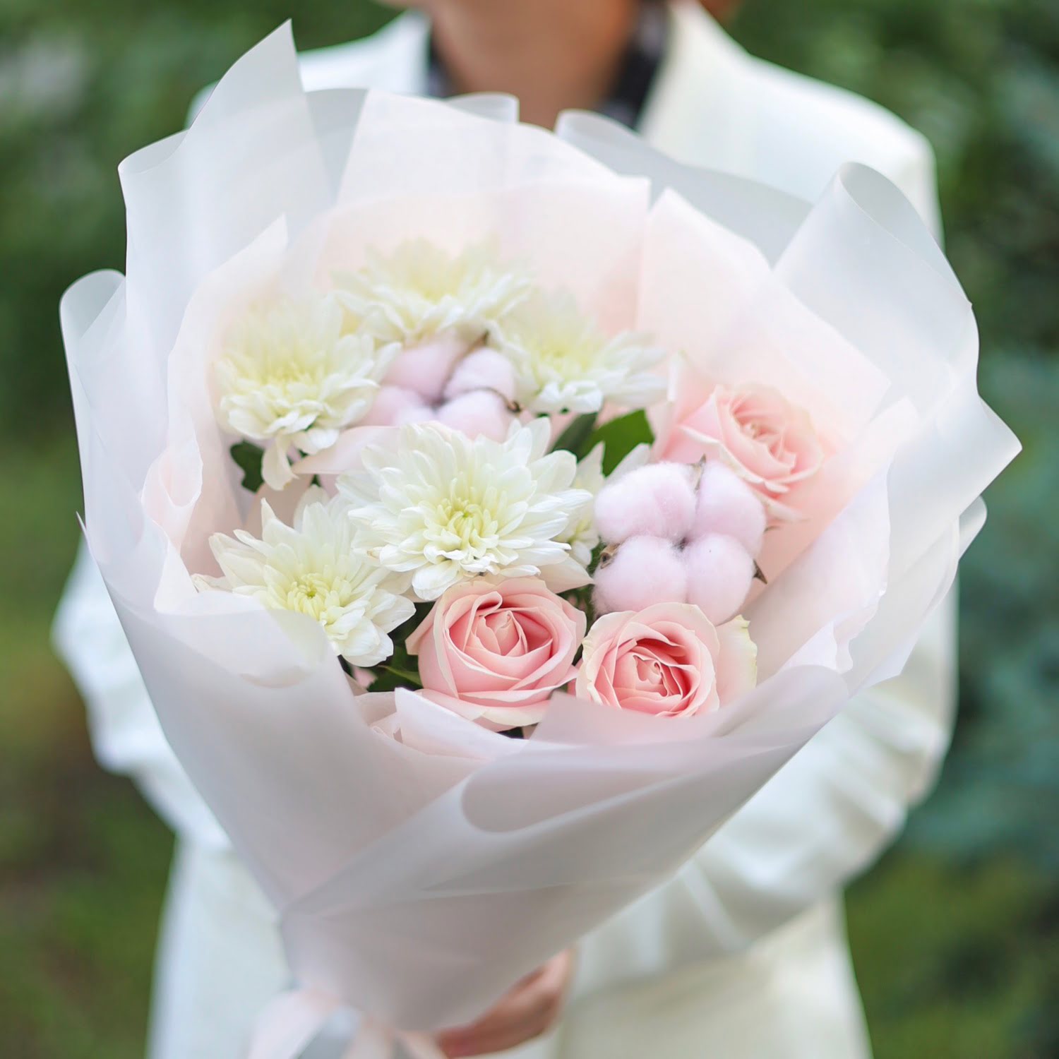 Состав: одноголовые розы, стойкая хризантема, хлопок.