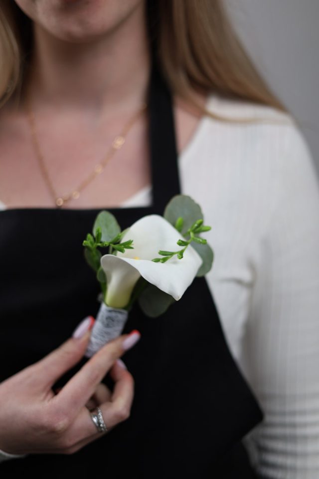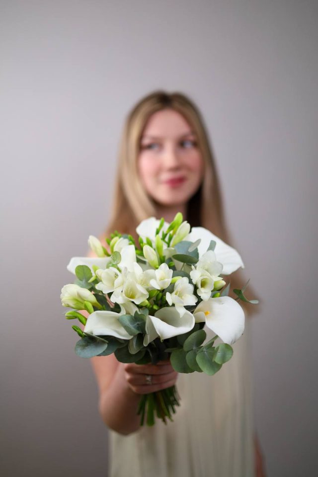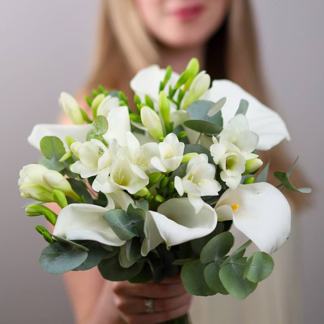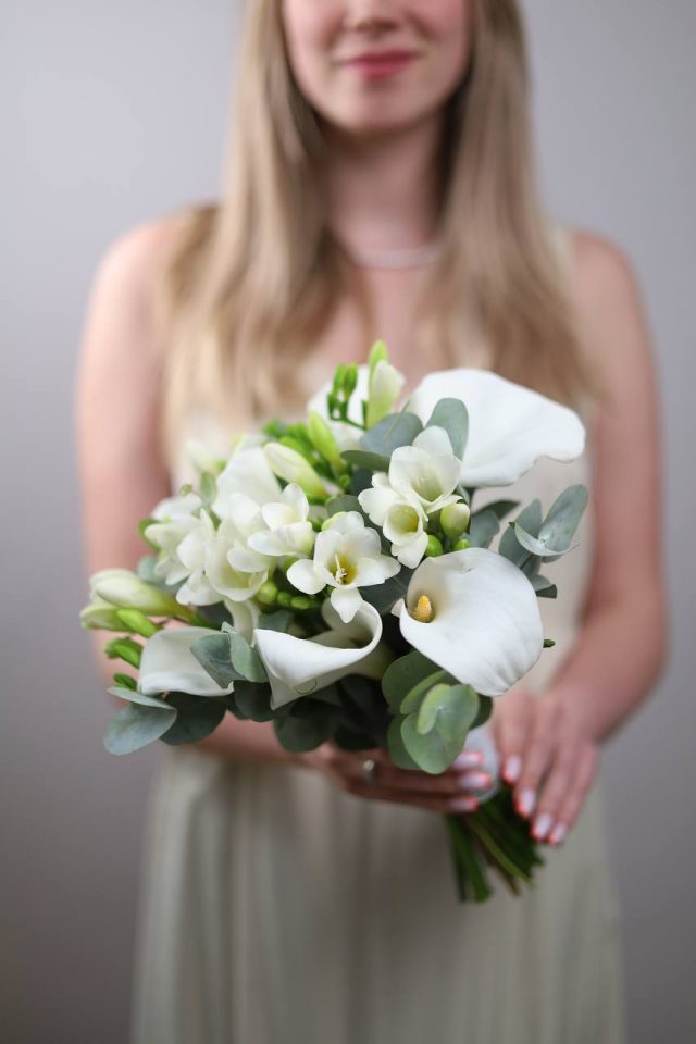 Свадебный букет невесты с белоснежными каллами, фрезией и душистым эвкалиптом.