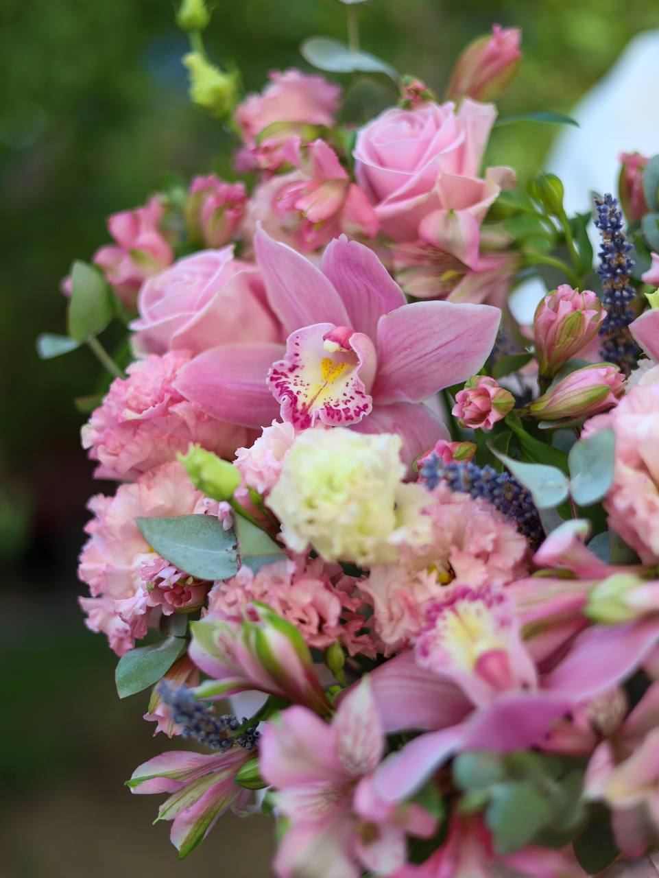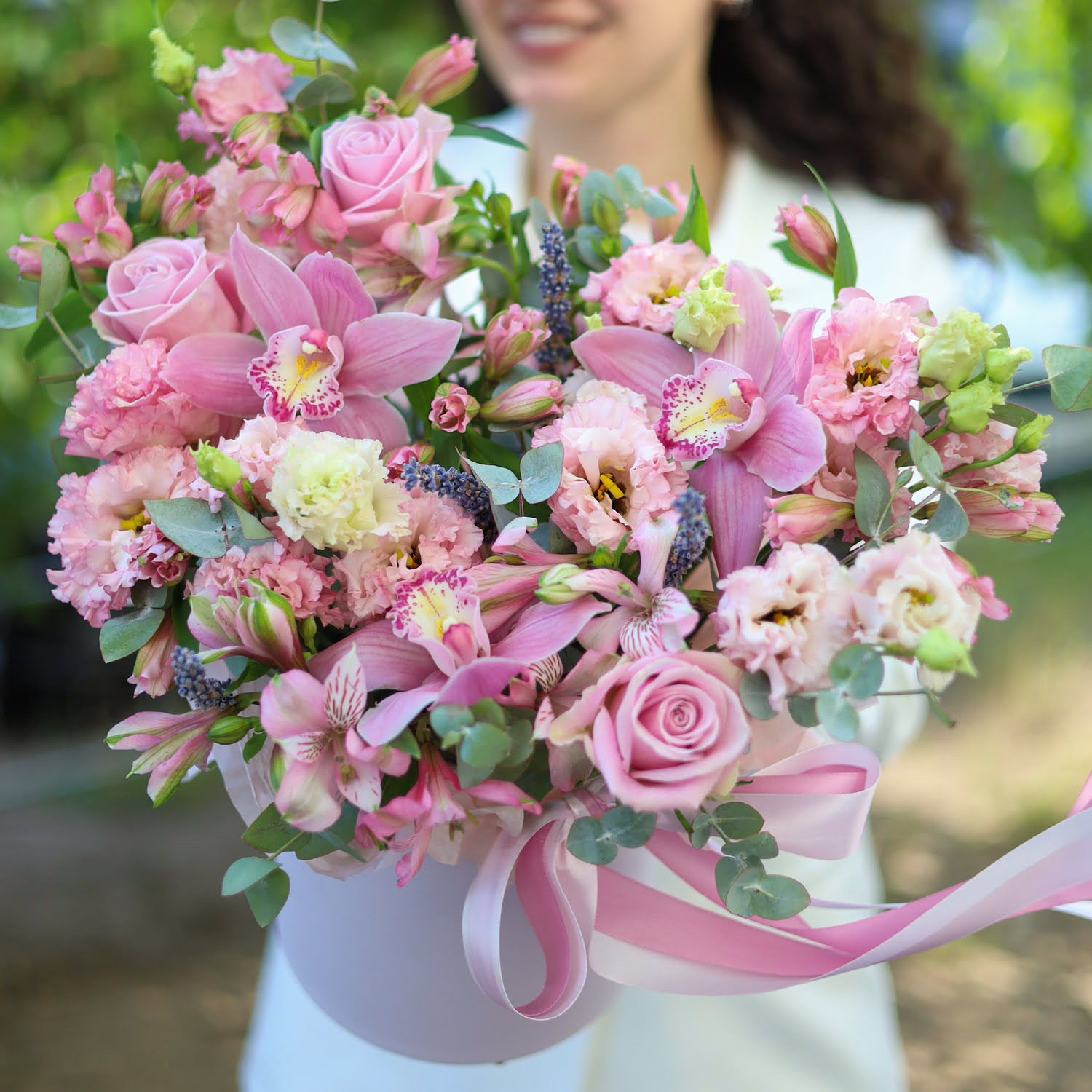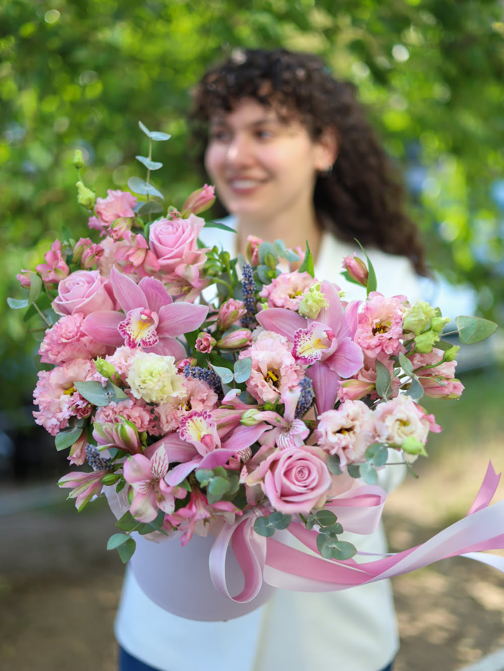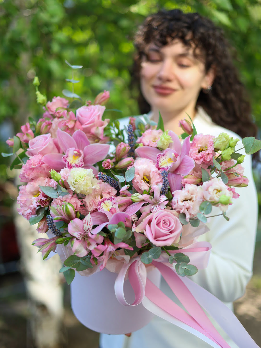 Состав: ажурная эустома, стойкие орхидеи и альстромерии, одноголовые розы, ароматная лаванда и эвкалипт.