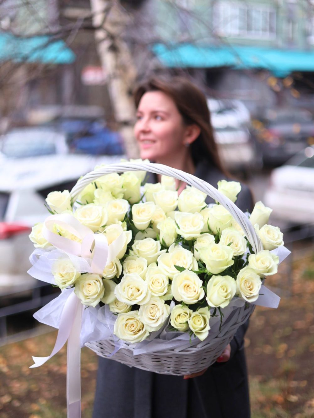 Красивая роскошная корзина из 51 белой розы в плетеной корзине.