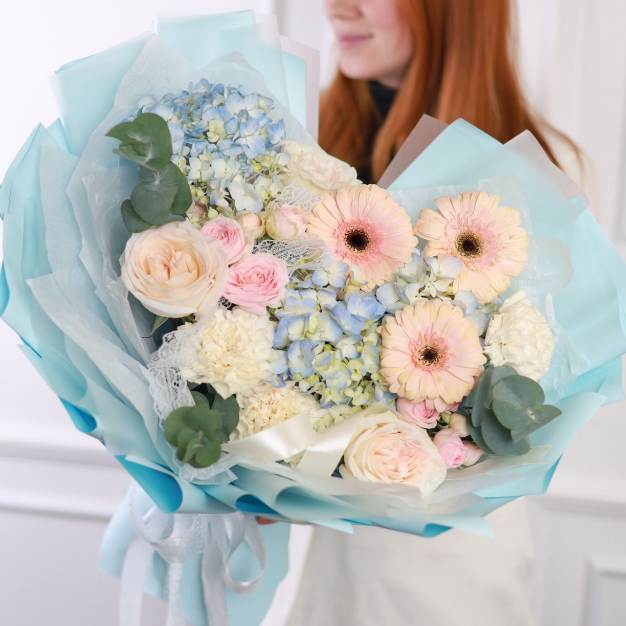 Букет в оформлении с крупной и кустовой пионовидной розой, герберой, стойким диантусом и эвкалиптом.