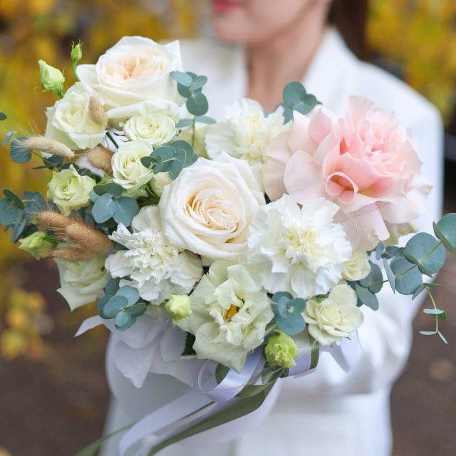 Состав: французские розы, стойкие диантусы, кустовые розы, одноголовые пионовидные розы, ажурная эустома, сухоцветы, эвкалипт.