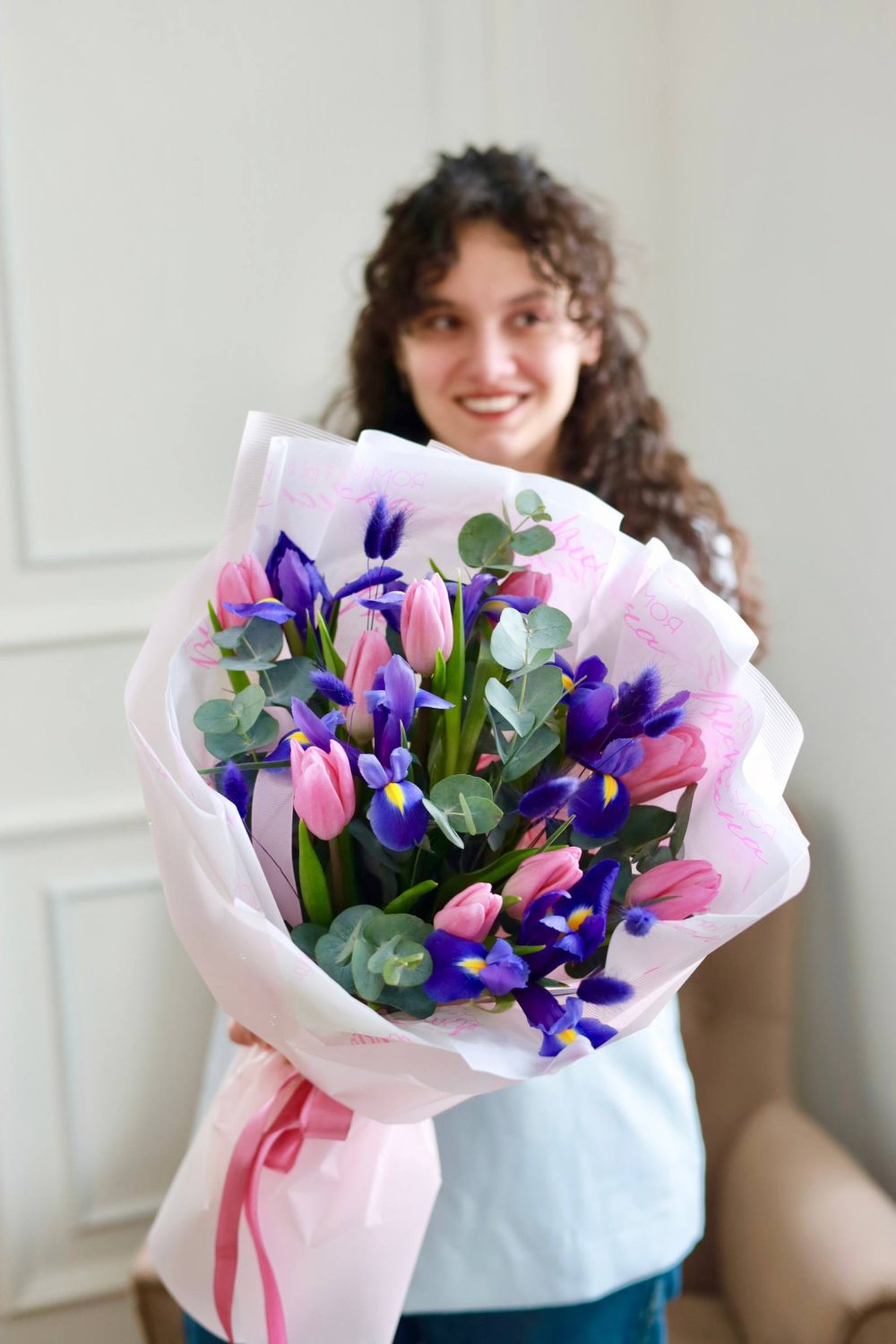 Состав: 9 тюльпанов, ирисы и эвкалипт.