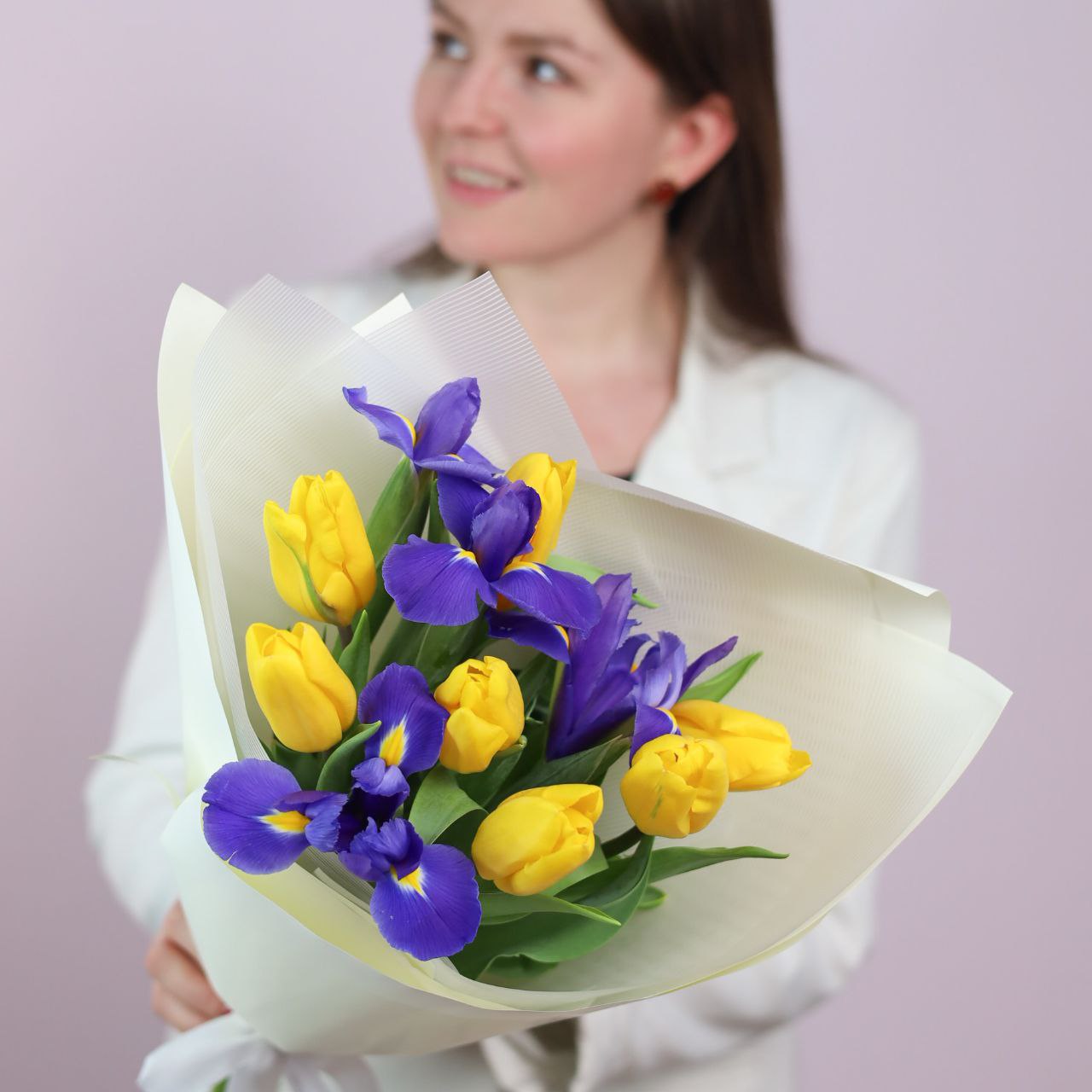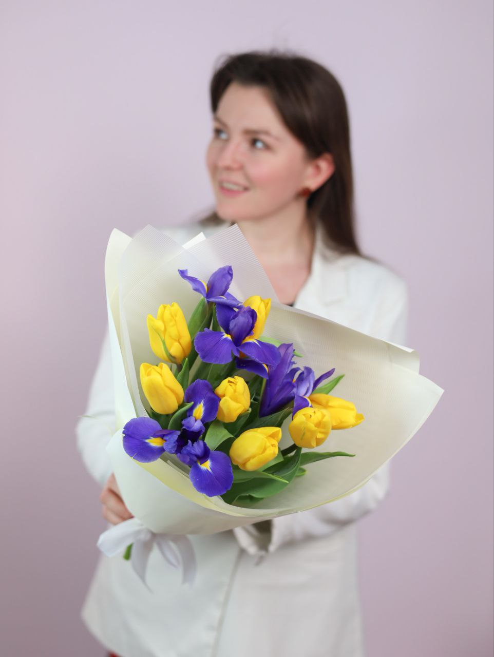 Букет с тюльпанами и ирисом в оформлении.