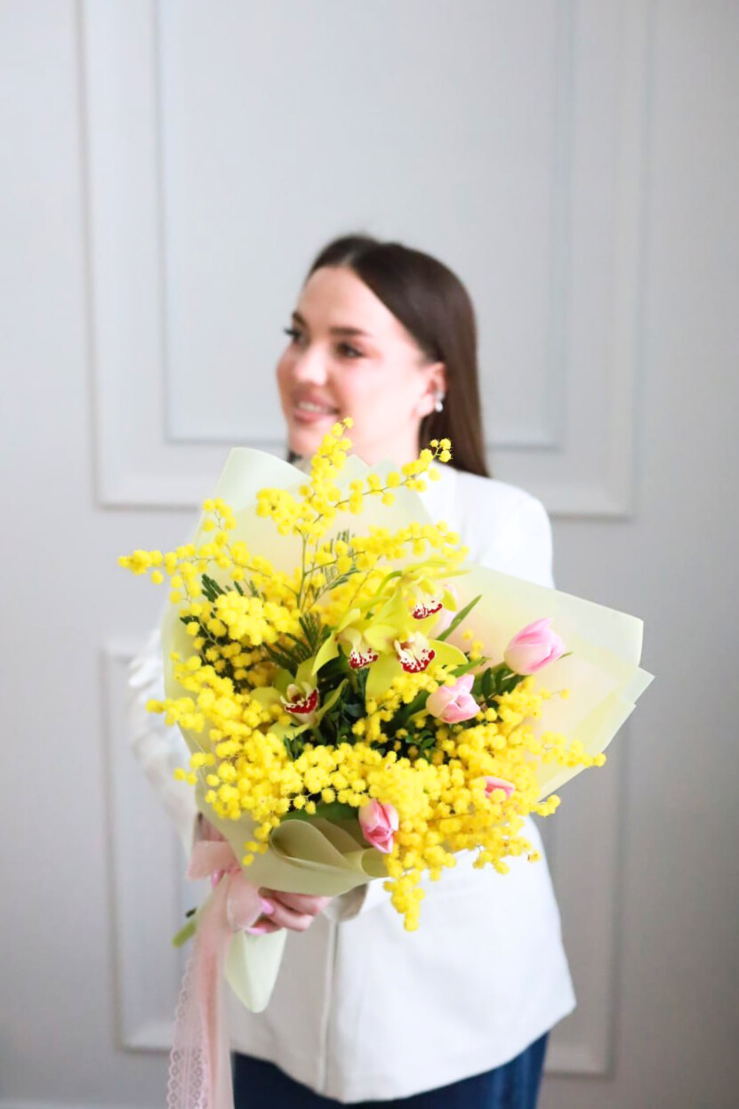 Прекрасный авторский букет с пушистой мимозой, орхидеями и тюльпанами.