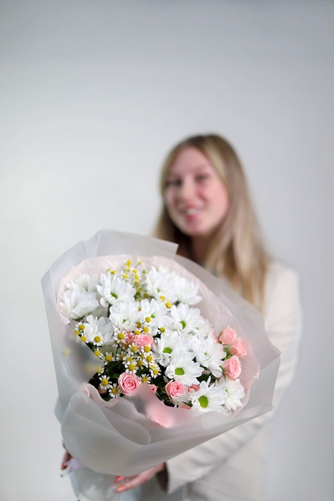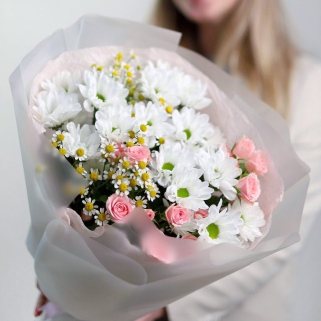 В букете: кустовые розочки, ромашки (танацетум), стойкая хризантема. Высота: около 50 см.