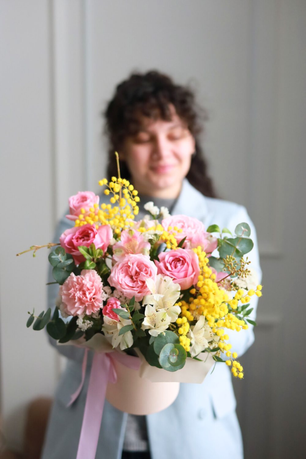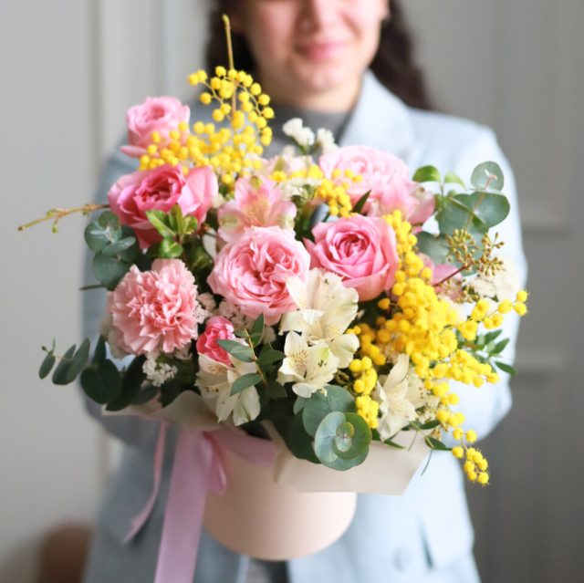 Яркая композиция с мимозой, розами, альстромерией, статицей и эвкалиптом.