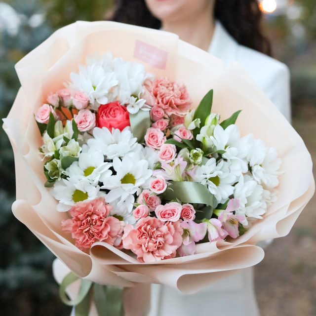 Основу букета составляют хризантемы, альстромерии и гвоздики, а также немного кустовой розы.