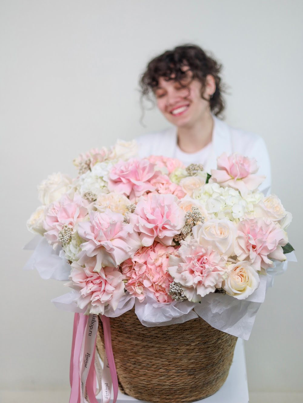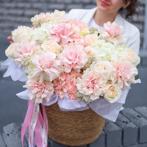 Невероятно нежная композиция из крупных ароматных цветов в розовой гамме. Композиция выполнена в плетеной корзине и украшена атласными лентами.