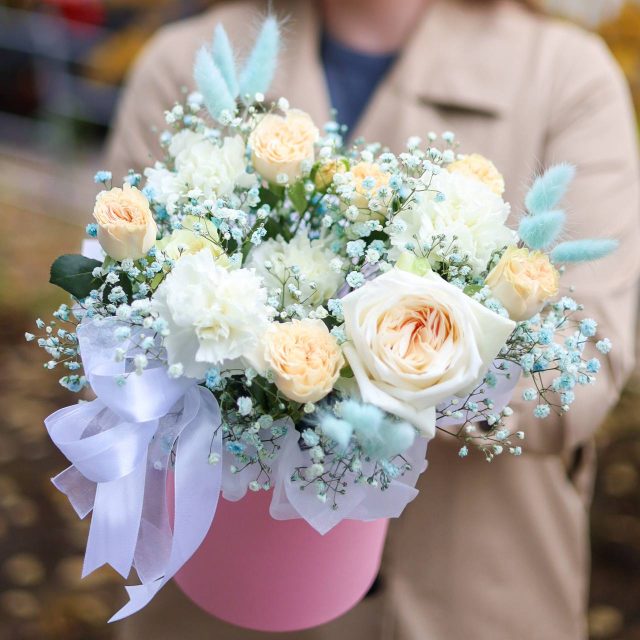 Композиция пионовидной розы, кустовых роз, стойких диантусов, лагуруса и стойкой гипсофилы в шляпной коробке.