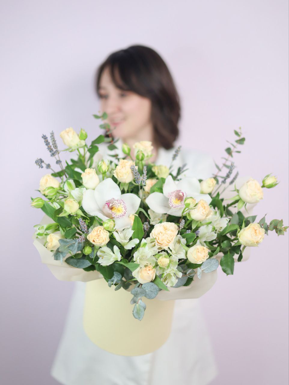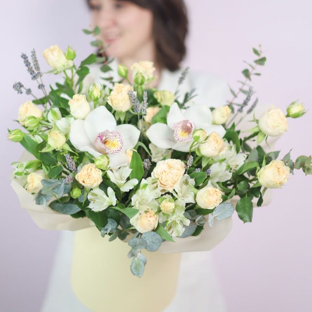 Состав: орхидея, кустовая пионовидная роза, альстромерия, эвкалипт, лаванда.