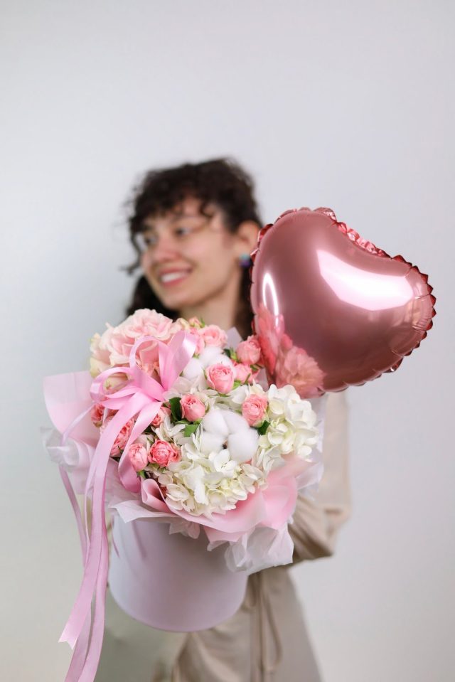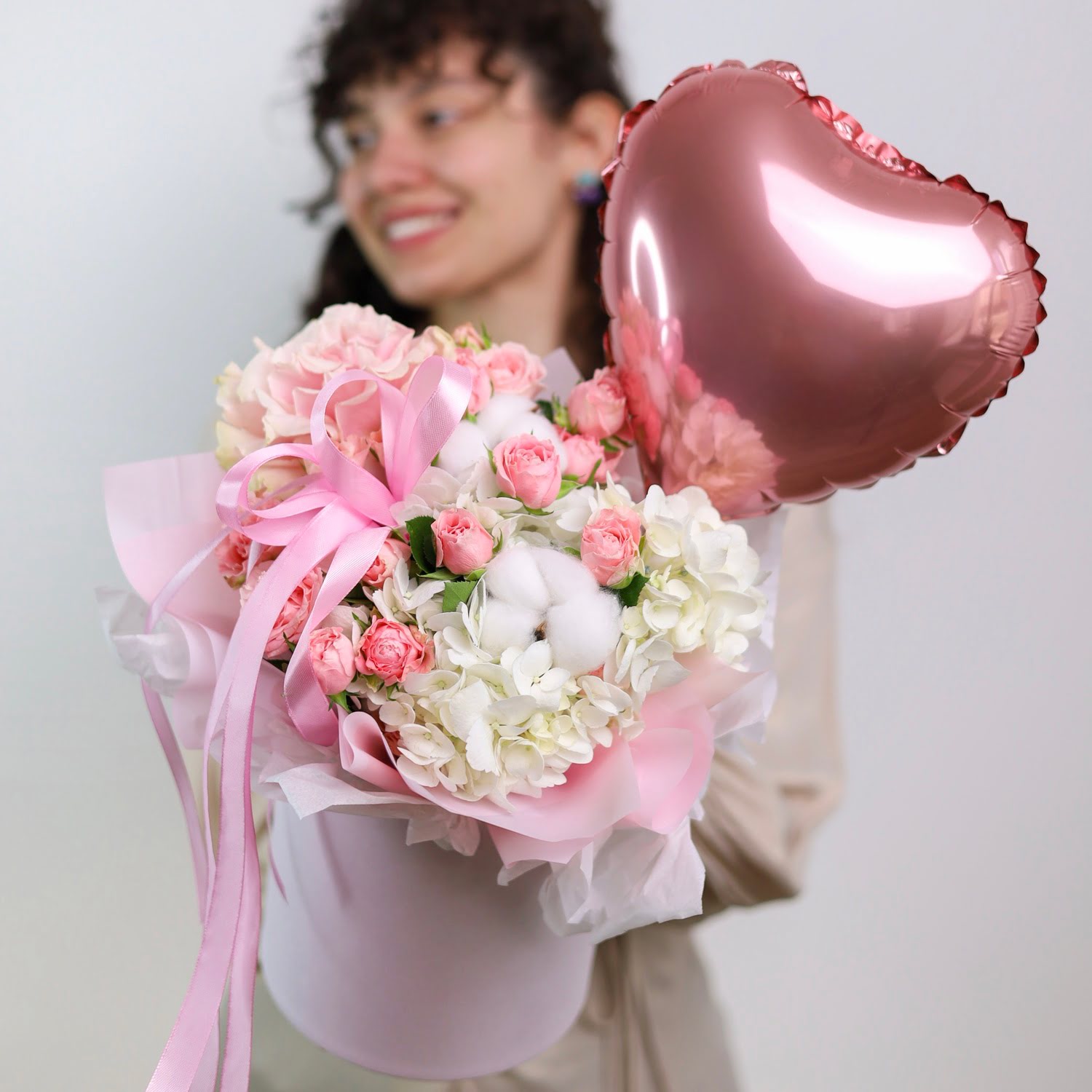 Очаровательная композиция в нежной бело-розовой гамме в шляпной коробке – сразу с декоративным шаром!