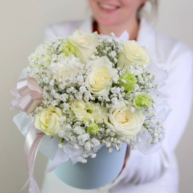 Композиция роз, ажурной эустомы, диантусов и стойкой гипсофилы в шляпной коробке.