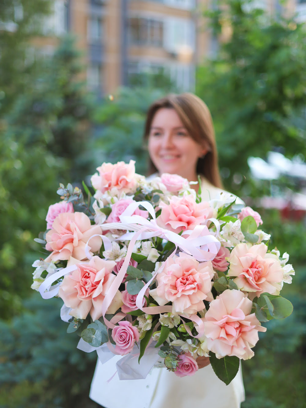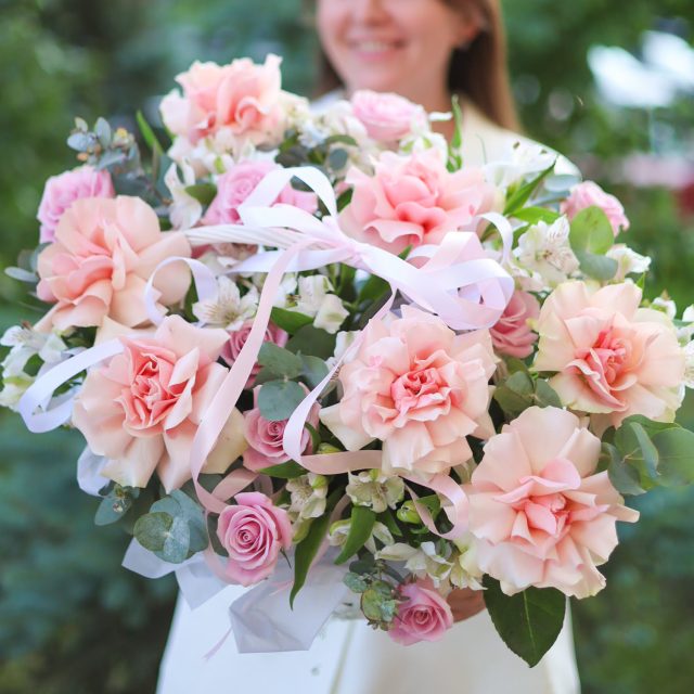 Состав: крупные французские розы, стойкая альстромерия, одноголовые розы, душистый эвкалипт.