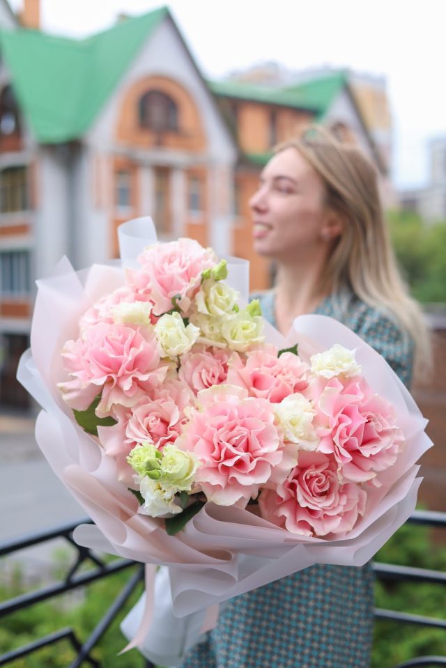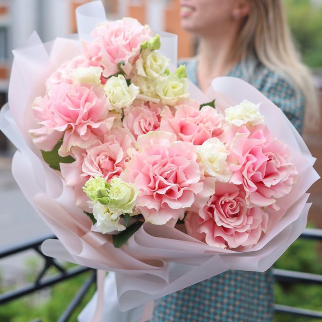 Очаровательный объемный букет из 9-ти крупных нежно-розовых французских роз и ажурной эустомы.