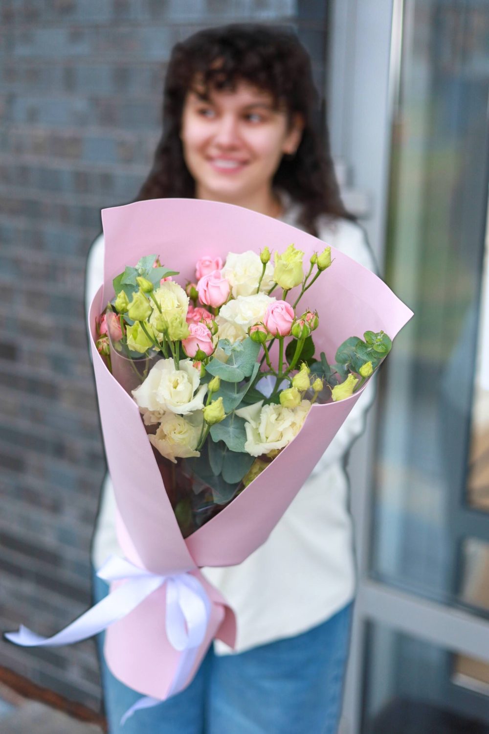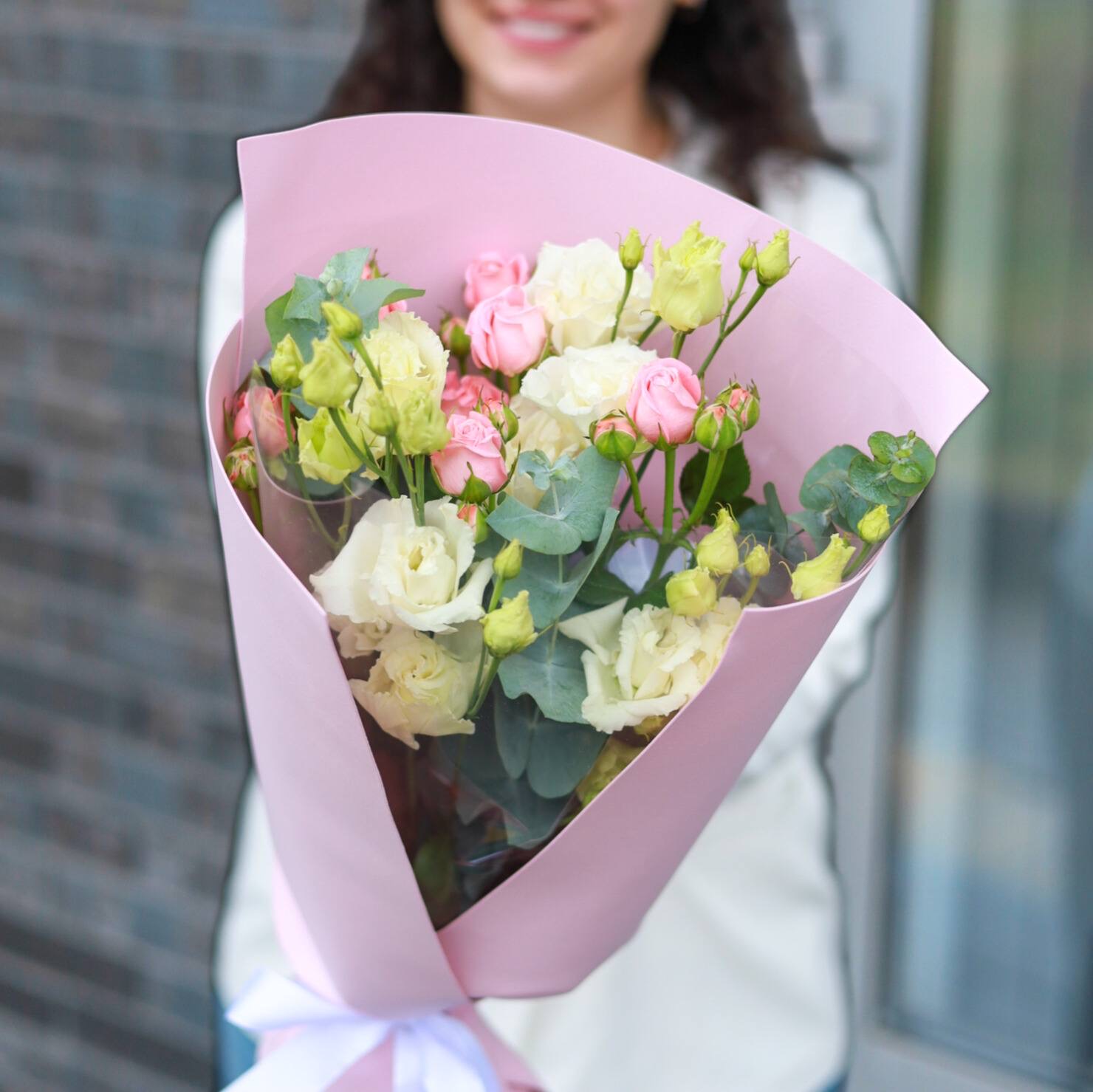 Красивый нежно-розовый букет с эустомой микс, кустовыми розами и эвкалиптом.
