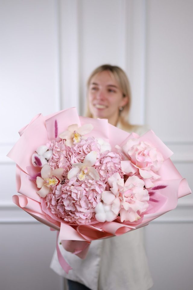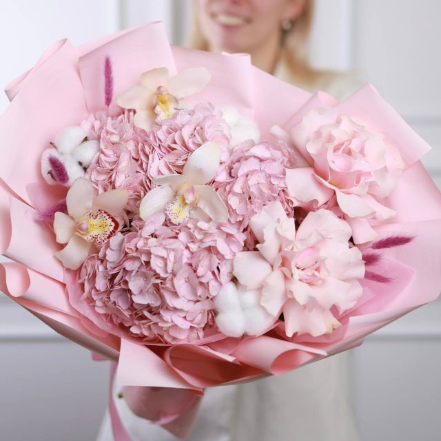 Букет объёмных гортензий, нежных орхидей, французских роз, хлопка и лагуруса в оформлении.