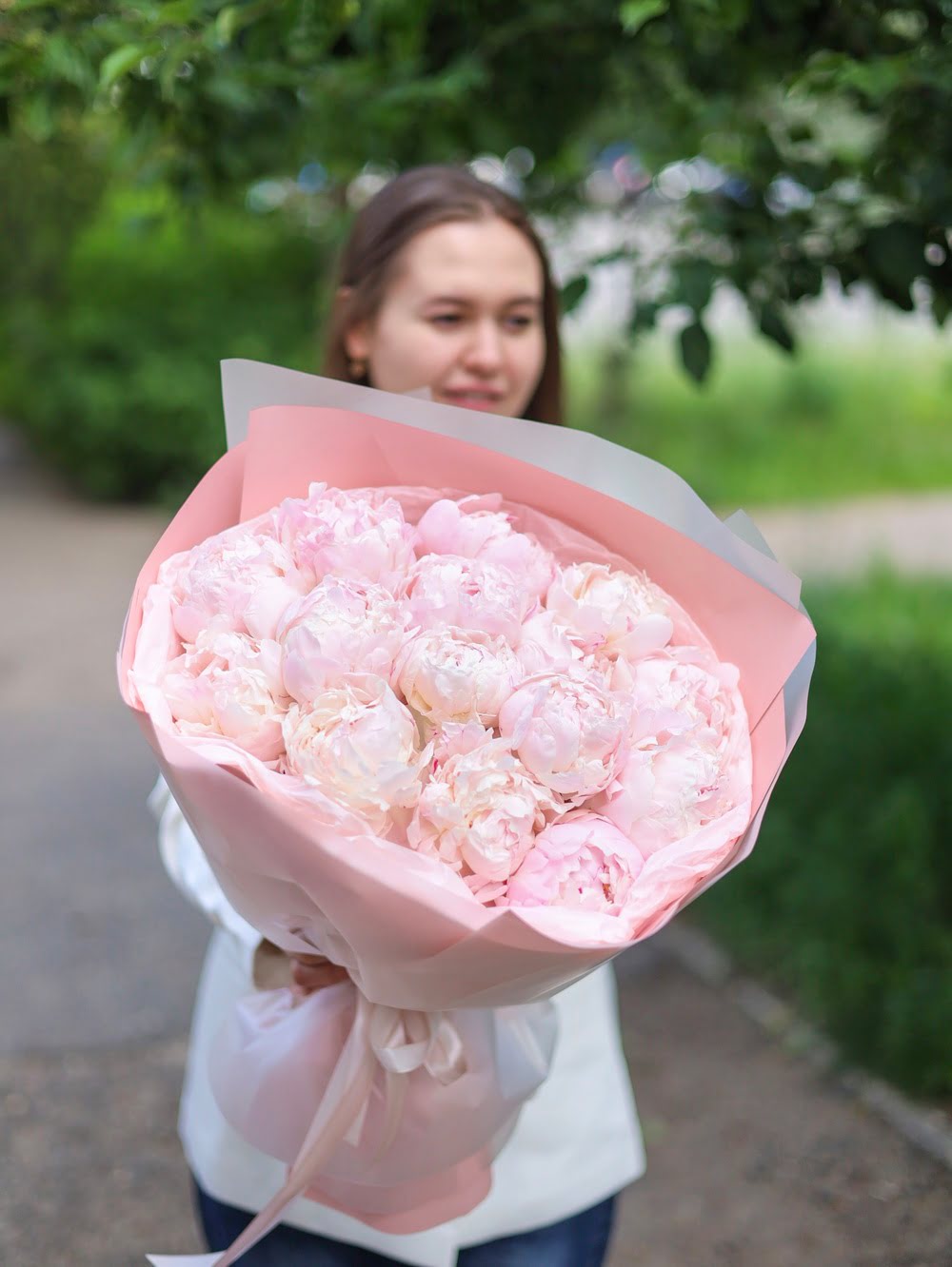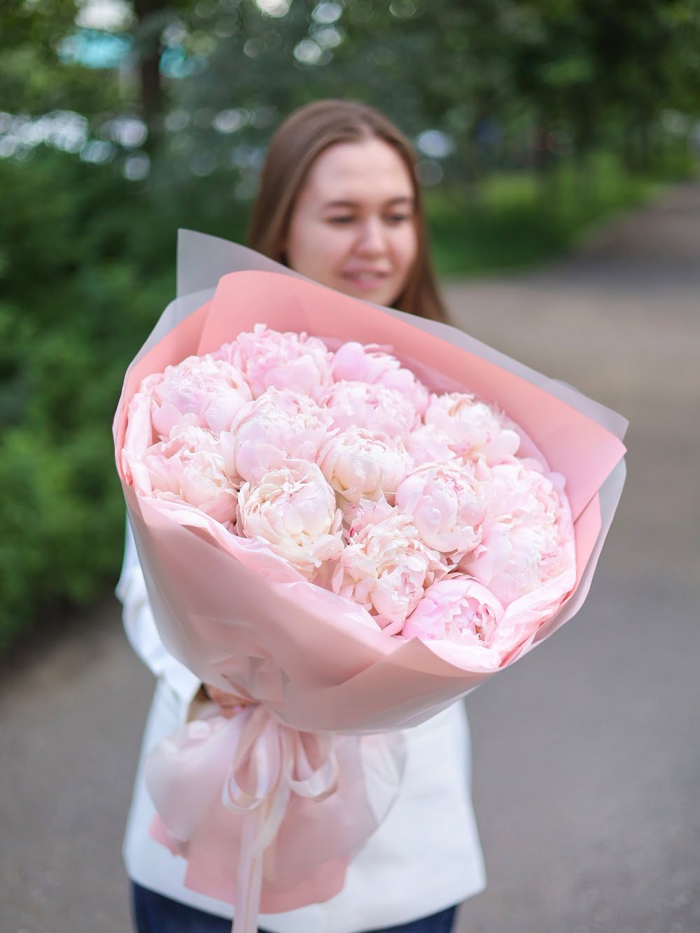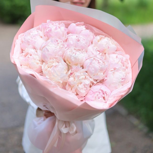 Прекрасный объемный букет из 15-ти светлых ароматных пионов в стильном оформлении.